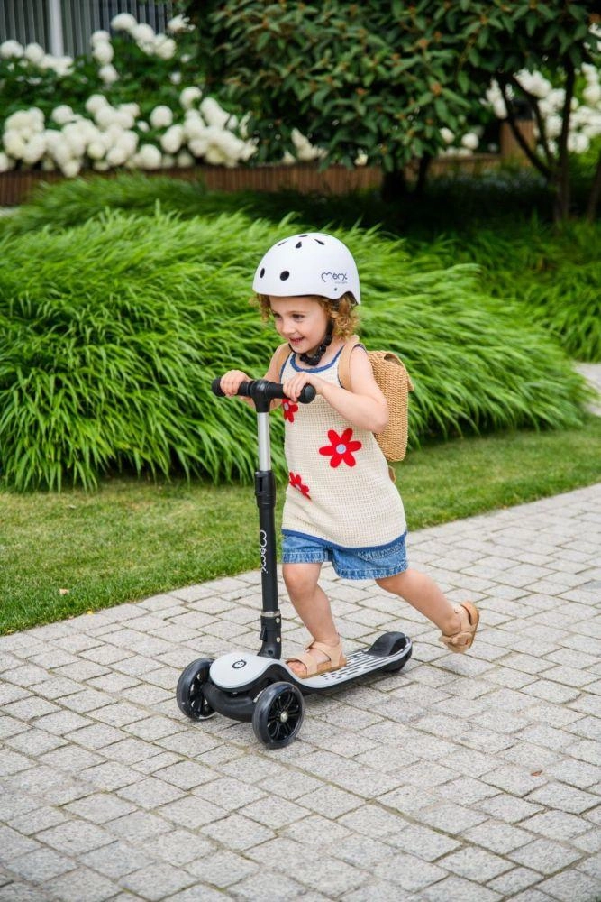 A MoMi San ideális első roller az egyensúly és a magabiztosság fejlesztéséhez. A két első és egy hátsó kerékkel rendelkező háromkerekű kialakítás kiváló stabilitást ad, míg a széles, csúszásgátlós fellépő és a kényelmes markolatok biztonságos irányítást tesznek lehetővé. A LED kerekek menet közben világítanak, így szórakoztatóbb és jobban látható a gyermek.
