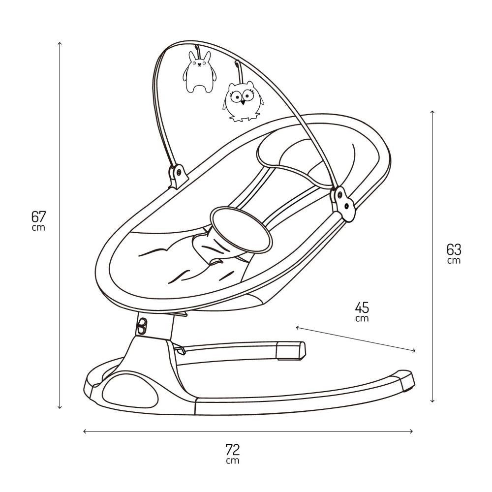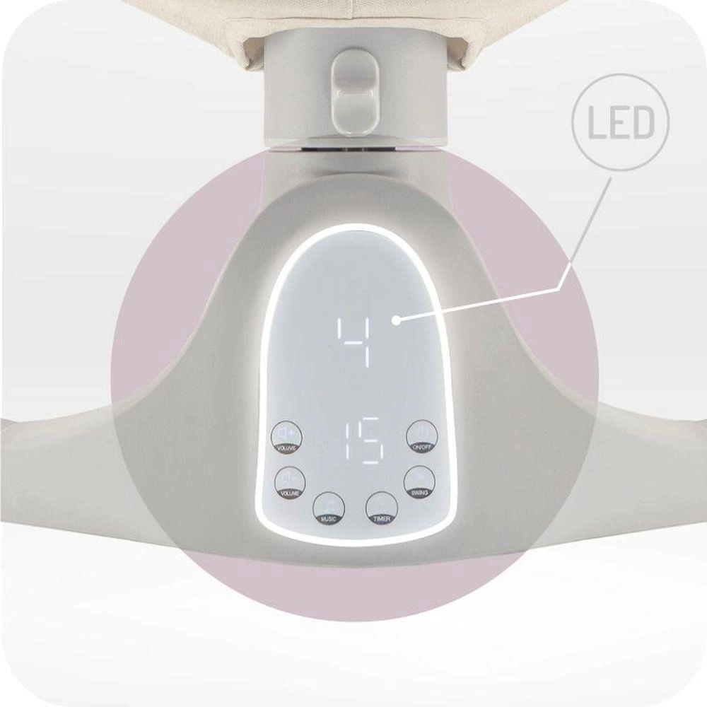 A beépített Bluetooth modul és a 10 dallam állítható hangerővel kellemes atmoszférát teremt. Az öt fokozatú ringatási tartomány hűen utánozza az anyaméhben tapasztalt mozgást, az időzítő pedig 8, 15 vagy 30 percre állítható, így könnyen kialakítható az ideális altatási rutin. A csúszásgátló tappancsok és az öt pontos övek maximális biztonságot nyújtanak.