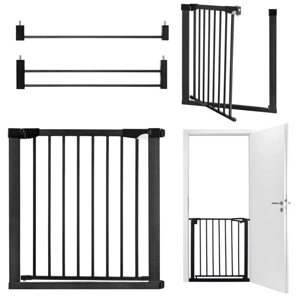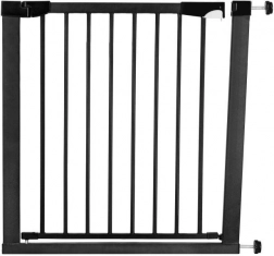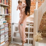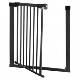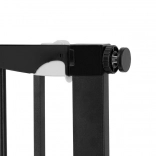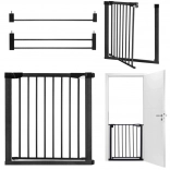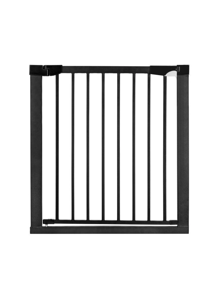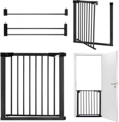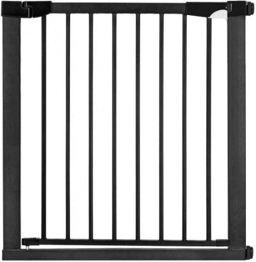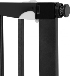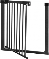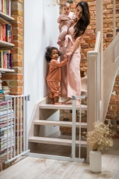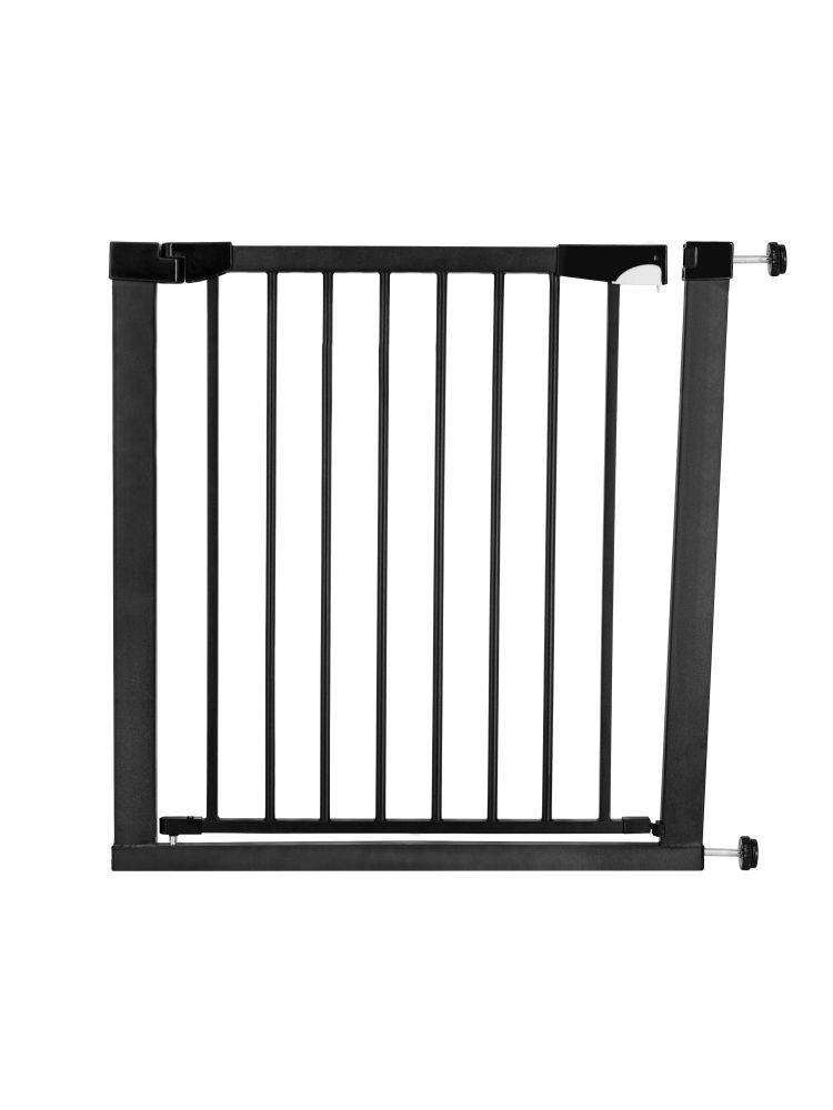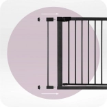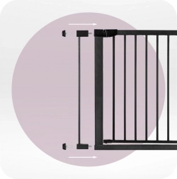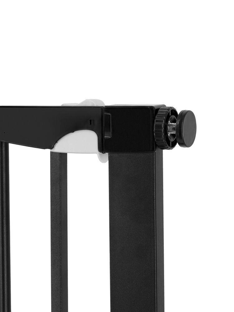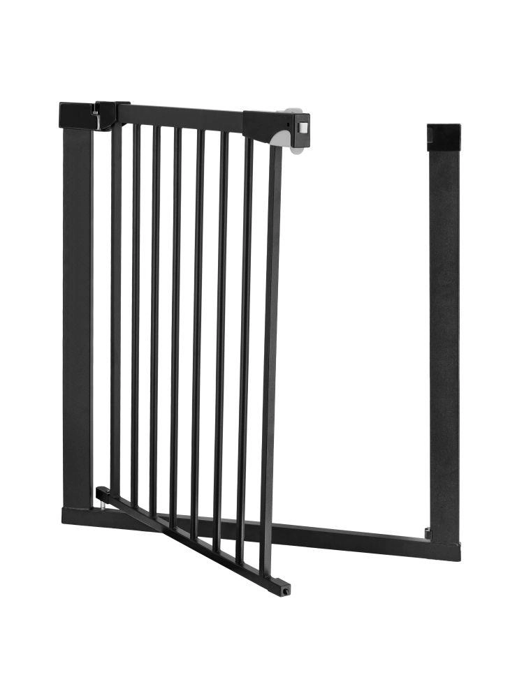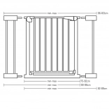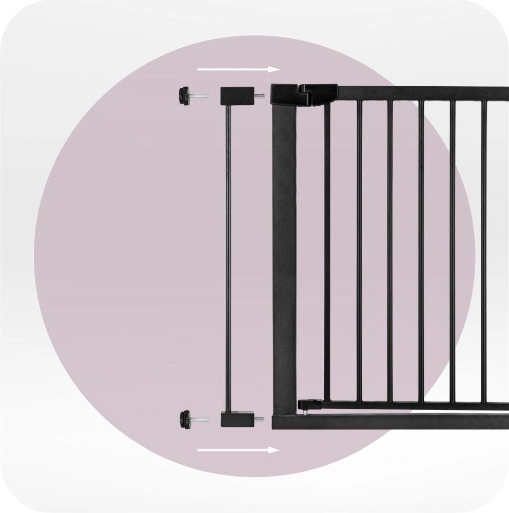 Az alap szélesség 75–82 cm, a mellékelt 7 cm-es és 14 cm-es hosszabbítókkal akár 103 cm-re bővíthető. A kapu két irányba nyílik, praktikus rögzítéssel rendelkezik, és 90°-ra nyitva marad a kényelmes áthaladáshoz. A dupla zárórendszer megakadályozza, hogy a gyerekek önállóan kinyissák a kaput.