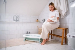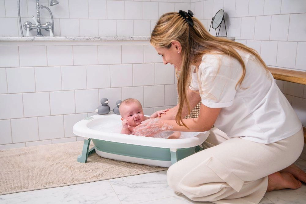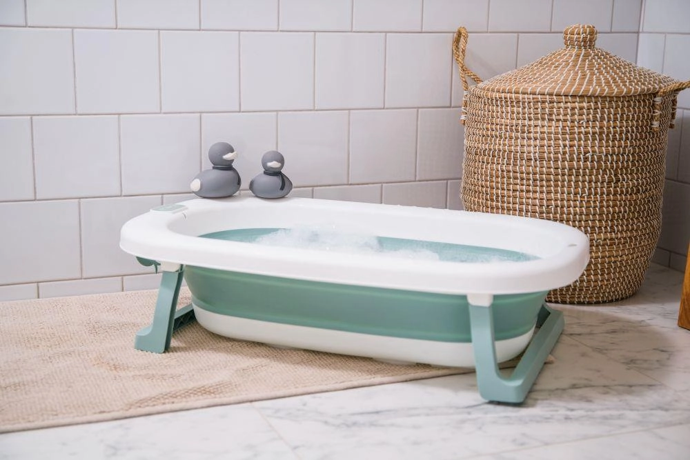 A kihajtható lábak gumírozott talpai megakadályozzák az elcsúszást, és szilárdan a helyén tartják a kádat. Így a baba fürdetése kényelmes és biztonságos.