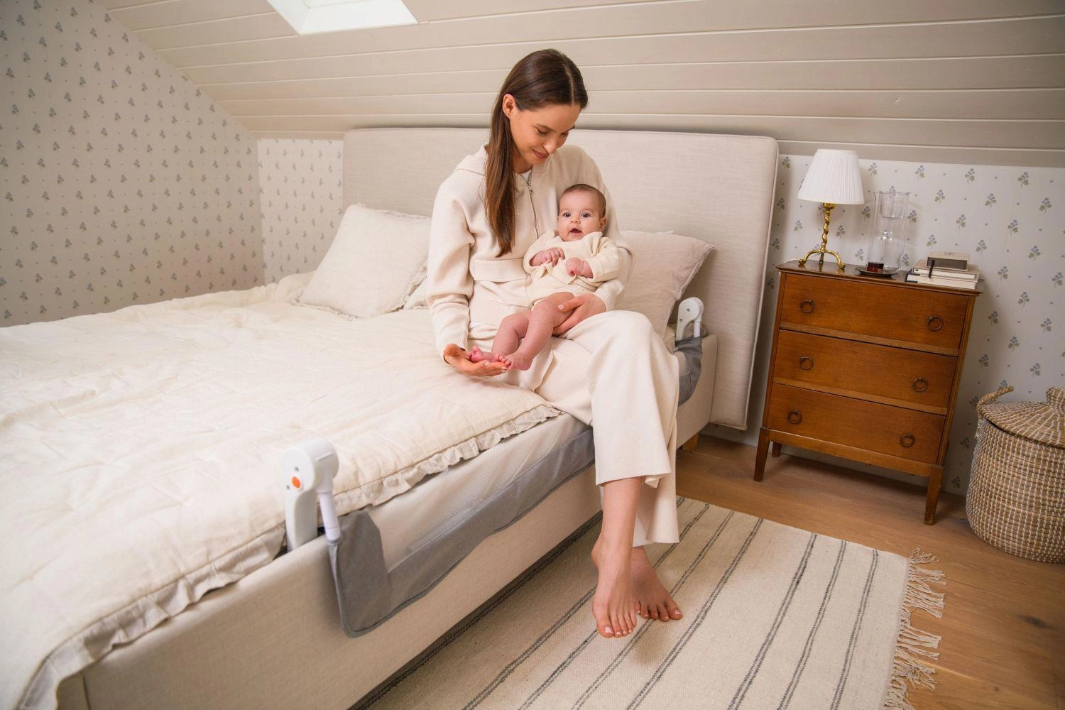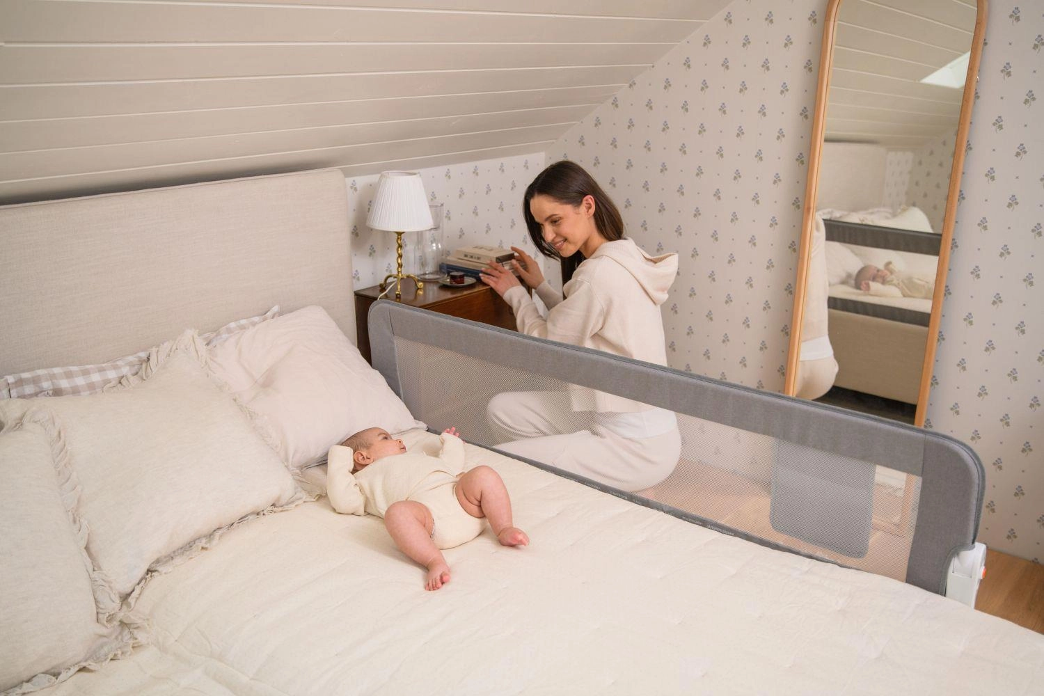 A felszerelés egyszerű és gyors – szerszámok nélkül. A védőrácsot az ágykerethez lehet csavarozni, vagy a matrac alá lehet csúsztatni és pántokkal rögzíteni. A praktikus nagy zseb kéznél tartja a legszükségesebb apróságokat. A 180°-os nyitás megkönnyíti a felkelést leszerelés nélkül.