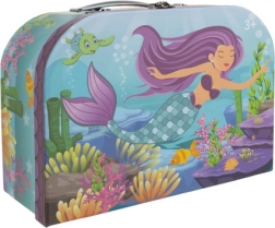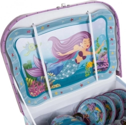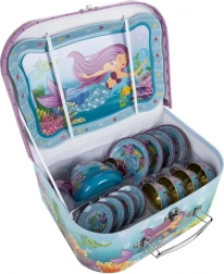 A készletben kanna, csészék, tányérok és szervírozótálca található, finom tengeri színekben, sellők, korallok és halacskák illusztrációival. A praktikus fém bőrönd rendet, könnyű hordozhatóságot és védelmet biztosít az egész szettnek – tökéletes ajándék 3 éves kortól.