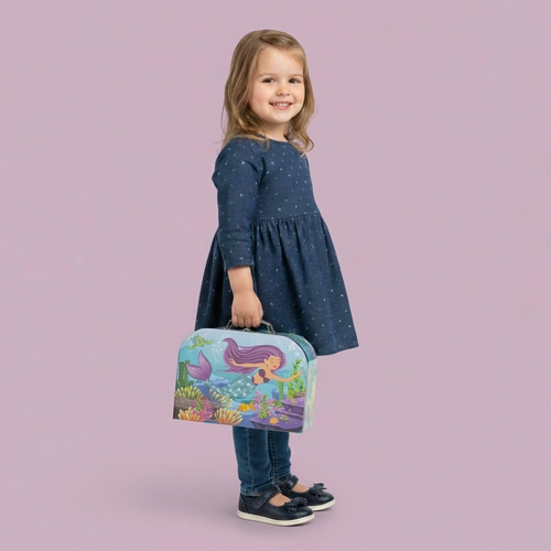 Varázslatos gyermek teáskészlet tengeri sellő motívummal, masszív fém bőröndben – öröm minden kis házigazdának. Tartalmaz egy fém kannát, csészéket, tányérokat és tálcát – összesen 9 elem. 3 éves kortól biztonságos, BPA-mentes, simára kidolgozott élekkel és strapabíró kivitelben fémből és rozsdamentes acélból. Könnyű, könnyen tisztítható, és a praktikus bőröndnek köszönhetően útra is ideális.