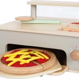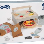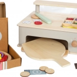 A small foot minőségi fa pizzériája remek kiegészítő minden gyerekkonyhához. A forgó, kattanó hangot adó gombbal ellátott sütő egyben kamra és eladópult is. A gyerekek a fa lapáton süthetnek, szeletelhetnek és tálalhatnak, a gazdag tartozékoknak köszönhetően pedig szakácsot és eladót is játszhatnak.