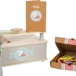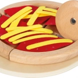 A tömör fából készült pizzaszeleteket tépőzár tartja össze, és a pizzavágó kerékkel könnyen szétválaszthatók. A színes filc hozzávalók – paradicsom, sajt, hagyma, gomba, paprika és kolbász – támogatják a kreativitást és a fantázia fejlődését. Az övtáska pénztárcával, játékpénzzel és kártyaolvasóval modern hangulatot kölcsönöz a játéknak.