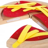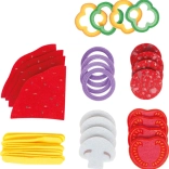 A fa pizzaszeletek tépőzárral kapcsolódnak egymáshoz, és a pizzavágó kerékkel könnyen szétválaszthatók. A filc feltétek támogatják a fantáziát és a végtelen ízkombinációkat.