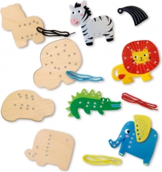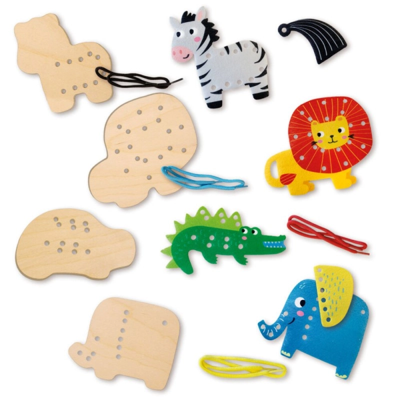 Ez a bájos, dzsungel témájú fűzős készlet ideális az óvodás korosztálynak. A színes zsinóroknak és állatfiguráknak köszönhetően a gyerekek fűzést és befűzést gyakorolnak, fejlesztik a finommotorikát, és tanulják a koncentrációt. Az állatmintás fa lapok (elefánt, krokodil, oroszlán, zebra) különböző formákat és nehézségi szinteket kínálnak.