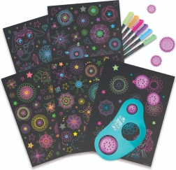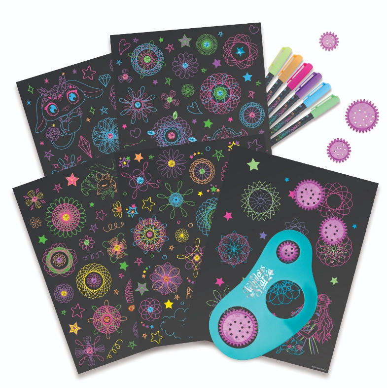 - Egyszerű és szórakoztató – helyezd a kereket a sablonba, rajzolj neon tollal, és figyeld, ahogy megszületnek a lenyűgöző spirálok.