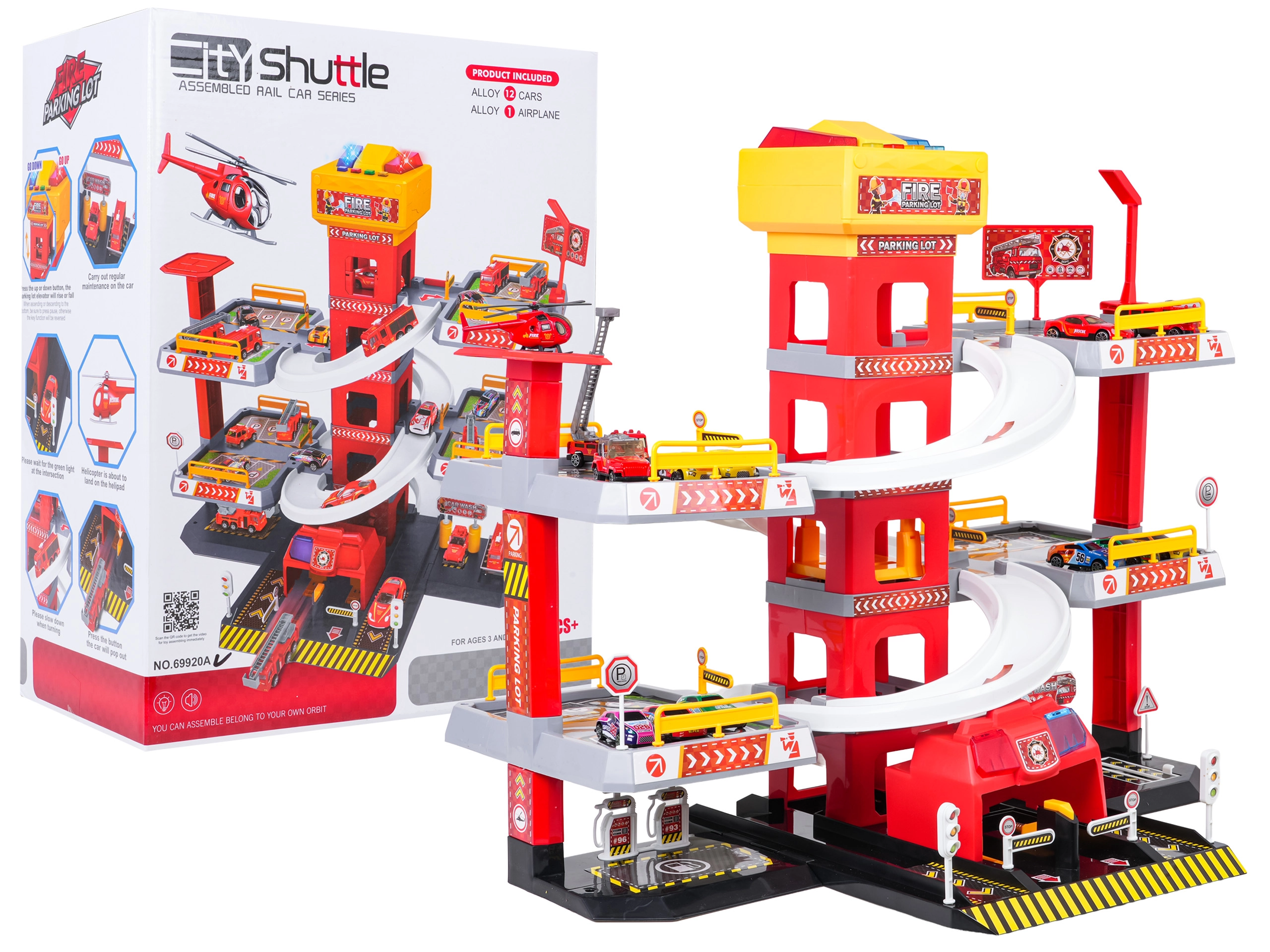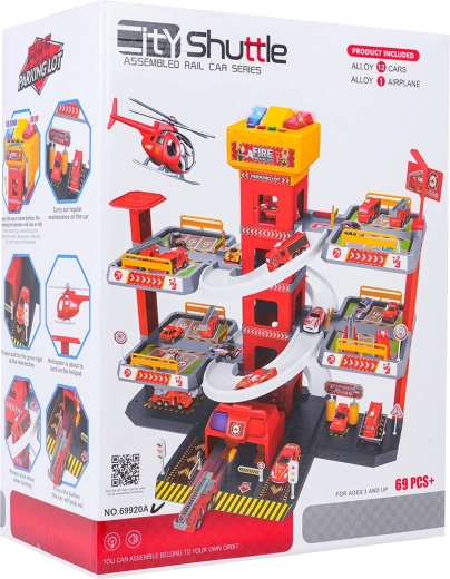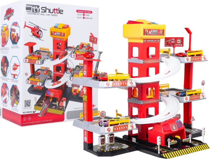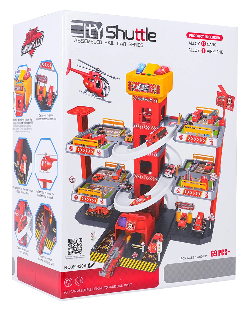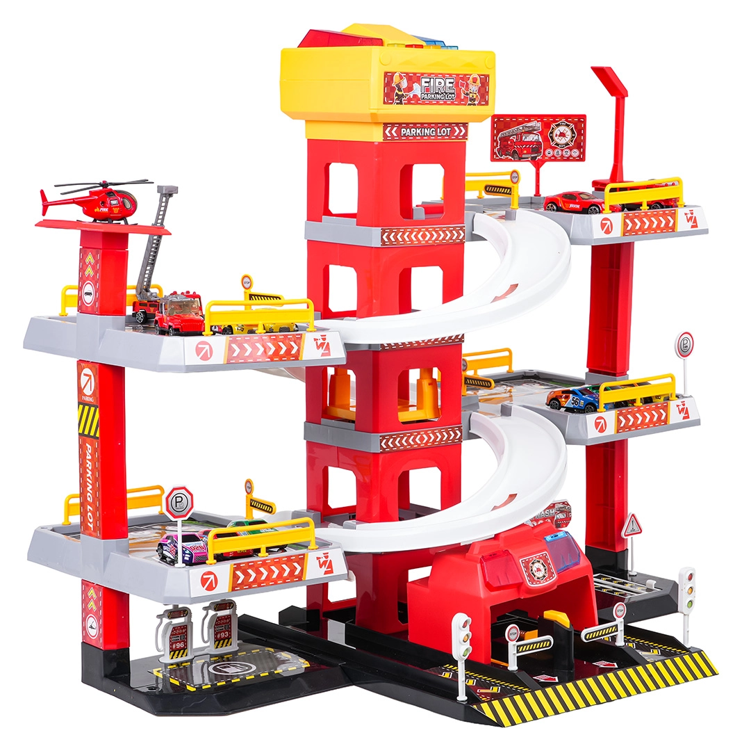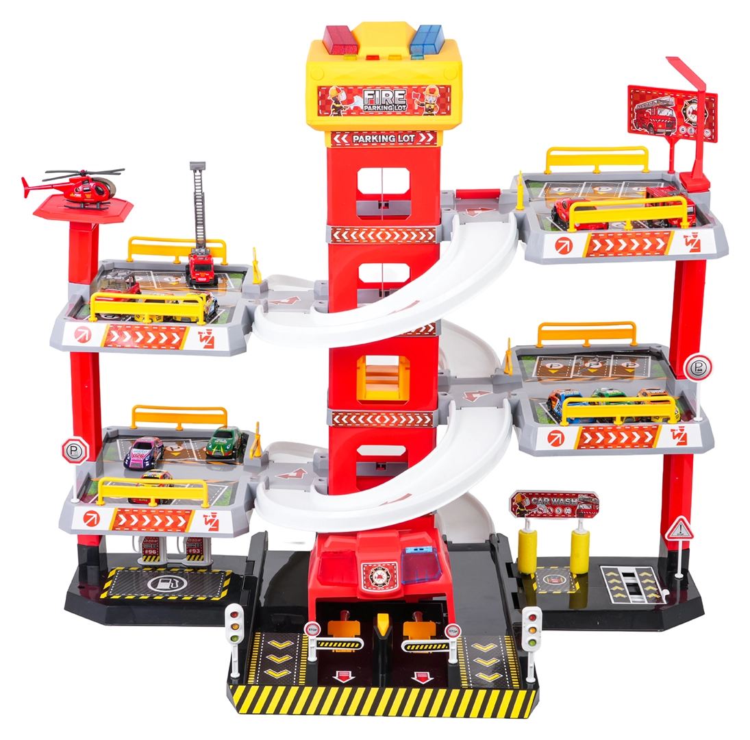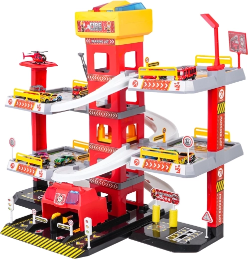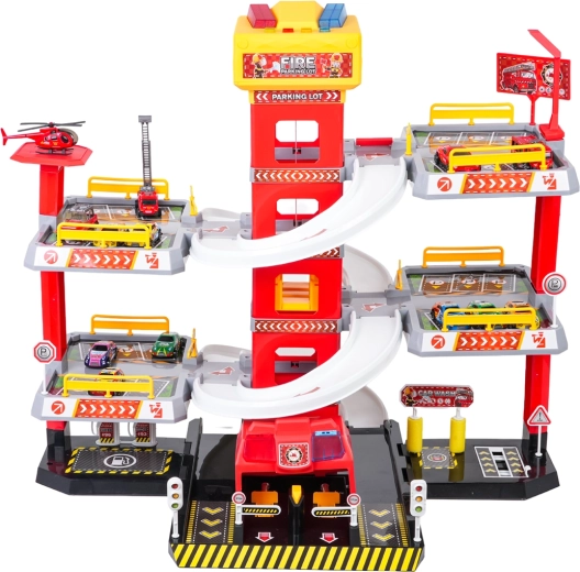 Ez a nagy, 3 szintes tűzoltó parkolóház valósághű és akciódús játékot kínál. A központi toronyban lévő lift segítségével az autók kényelmesen mozoghatnak a szintek között, vagy ívelt rámpákon száguldhatnak lefelé. A lift felső paneljén nagy, fel/le vezérlő gombok és négy kisebb gomb található a hanghatásokhoz – indítás, tolatás, gyorsítás, fékezés és egy dallam –, melyeket villogó fények egészítenek ki.