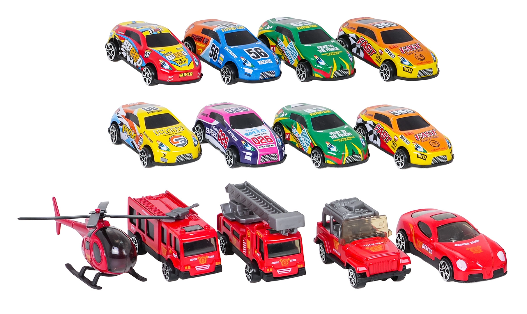 - Gazdag felszereltség: 12 kisautó + helikopter, jelzőtáblák és matricák