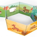 A készlet három kétoldalas leporellót tartalmaz erdei, vízi, réti, farmon játszódó és más jelenetekkel. A 2 mm vastag kartonból készült, masszív lapok bírják a gyerekek használatát.