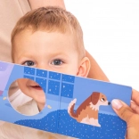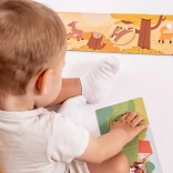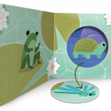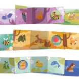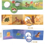 A három kétoldalas leporelló összesen hat különböző környezetet mutat be (pl. rét, erdő, legelő, víz vagy otthon), amelyekben a gyerekek összesen 24 állatkát fedezhetnek fel. A kör alakú ablakoknak és a behelyezhető zsetonoknak köszönhetően a gyerekek gyakorolják az állatok környezethez való párosítását és saját történetek kitalálását. A leporellók extra erős, 2 mm vastag kartonból készültek, méretük 43,5 × 10,5 cm, így a kicsik is könnyen kézben tarthatják.