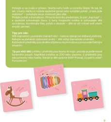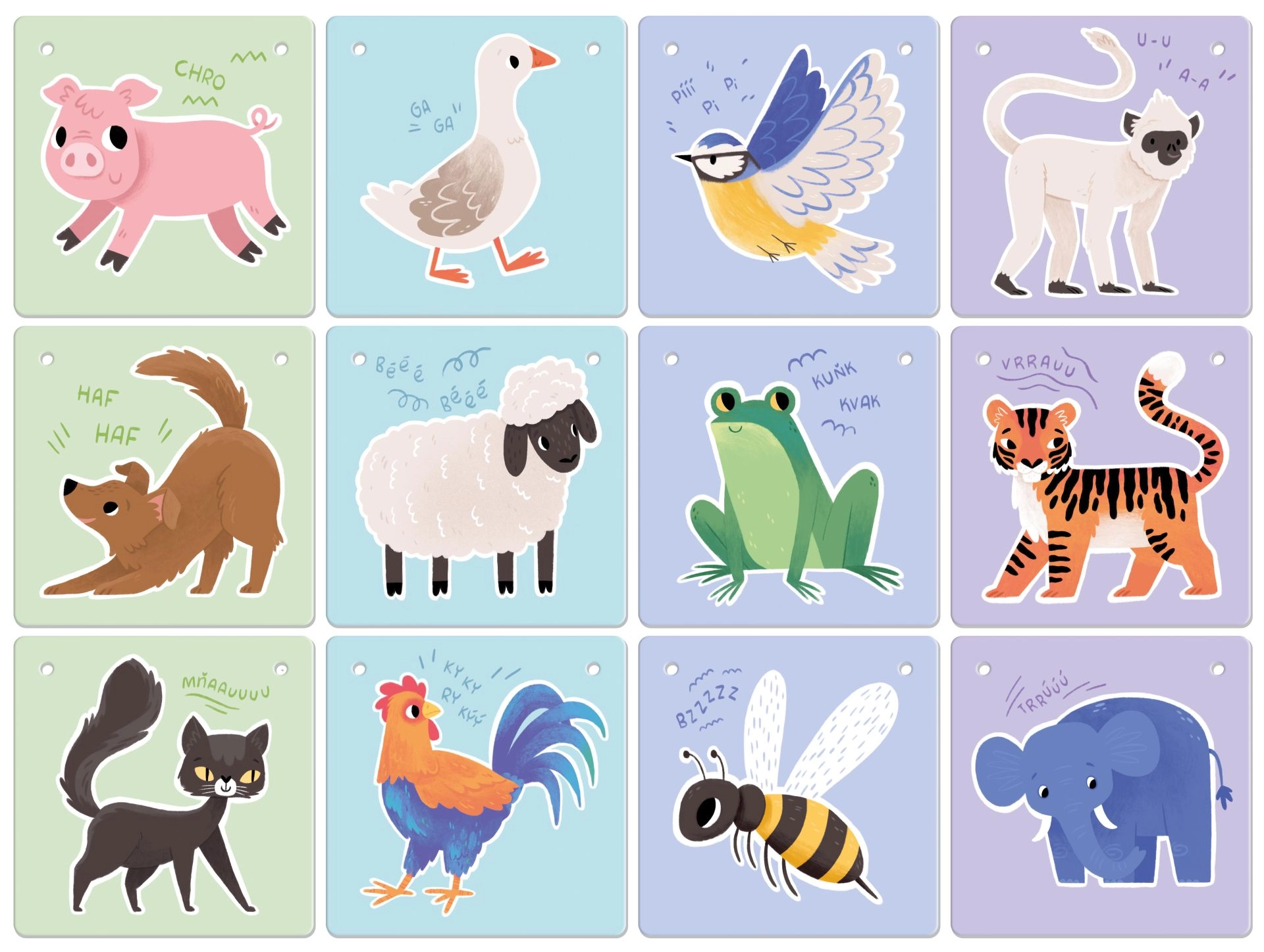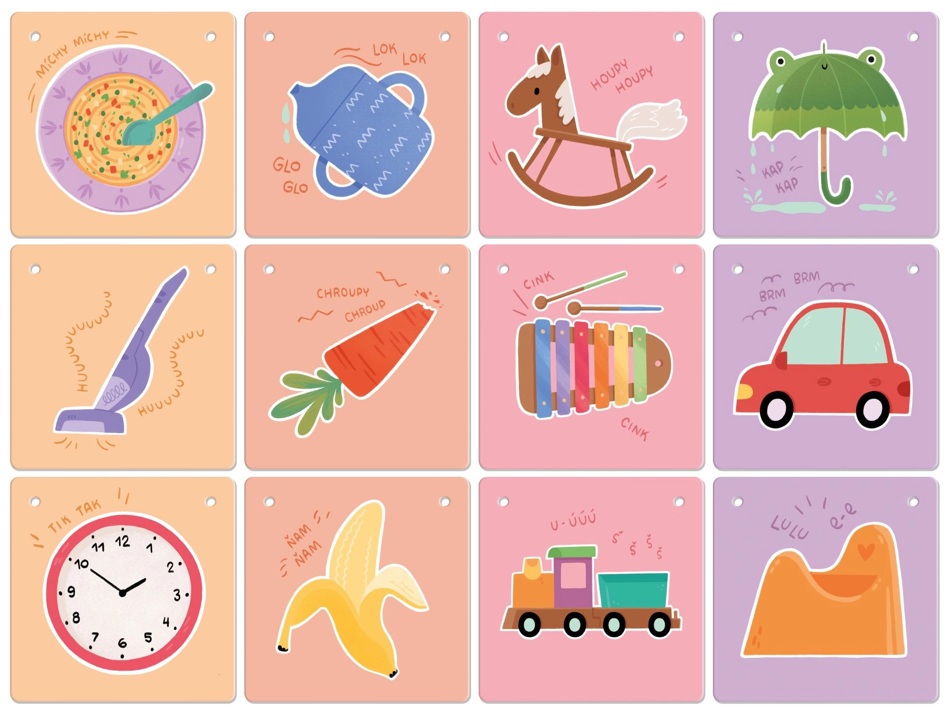 Ez a nagyformátumú kártyacsomag játékosan serkenti a beszédet abban az időszakban, amikor a gyerekek először hangokat utánoznak, és csak ezt követően alkotnak szavakat. A világos, jól érthető illusztrációk grafikai súgóval motiválják a gyerekeket a „miau”, „brm” vagy „vau” hangok ismétlésére, amellyel természetesen edzik a hallási megkülönböztetést, a memóriát és a nyelv ritmusát.