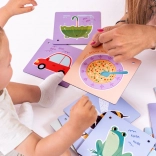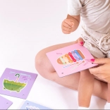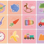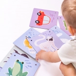Minden kártya mérete 15,5 × 15,5 cm, 2 mm vastag, műanyagmentes FSC kartonból készült – ennek köszönhetően a kártyák masszívak, biztonságosak és alkalmasak a mindennapos használatra. A készlet 12 kétoldalas kártyát tartalmaz (összesen 24 motívum: 12 állat + 12 tárgy), beleértve a szülőknek szóló tanácsokat játékötletekkel és fejlesztő tevékenységekkel.