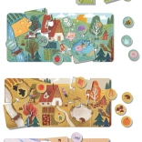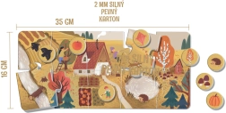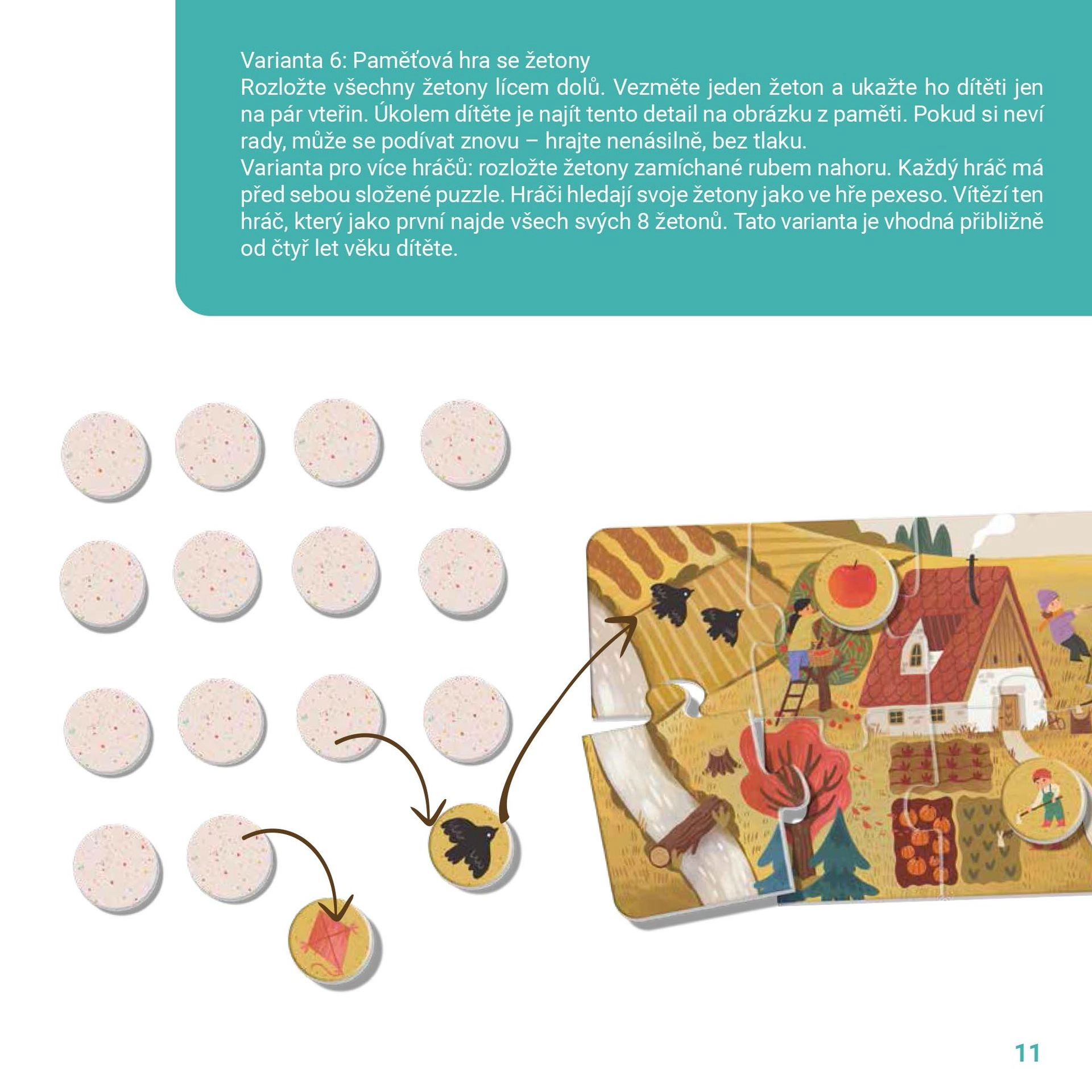 - A csomag tartalma: 4 nagy, tízrészes puzzle (tavasz, nyár, ősz, tél) + 4×8 kerek zseton részletekkel