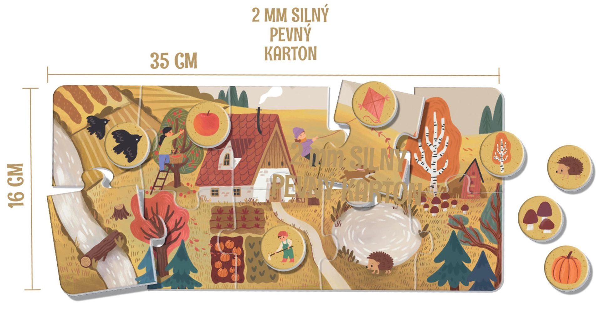 A játék kifejezetten apró kezekhez készült: az extra nagy, 2 mm-es FSC karton elemek tartósak, könnyen megfoghatók és teljesen műanyagmentesek. A tanulás természetesen zajlik – a gyerekek figyelmet gyakorolnak, bővítik a szókincsüket, és beszélgetnek az év közbeni természeti változásokról.