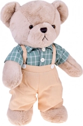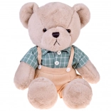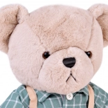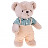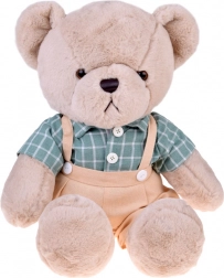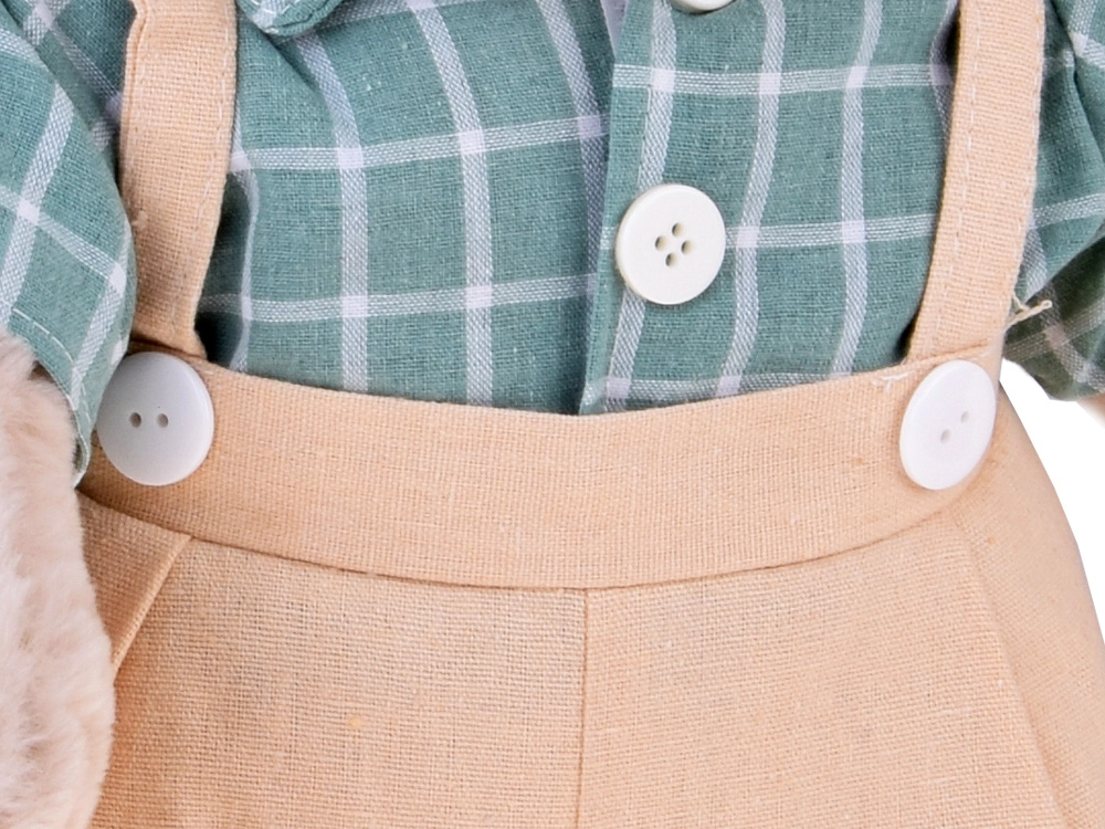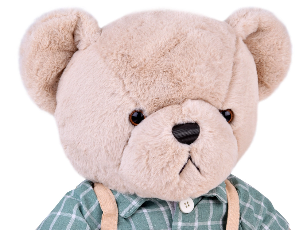 A bájos Franek plüss mackó 58 cm-es, elegáns vintage stílusú ölelgetnivaló társ. Puha, bézs bundája van, zöld kockás inget és bézs nadrágtartós rövidnadrágot visel. A ruhácskák tépőzárral könnyen levehetők, így a mackó tisztán tartása gyerekjáték. Ideális ajándék gyerekeknek és felnőtteknek, valamint szép dísz a gyerekszobába.