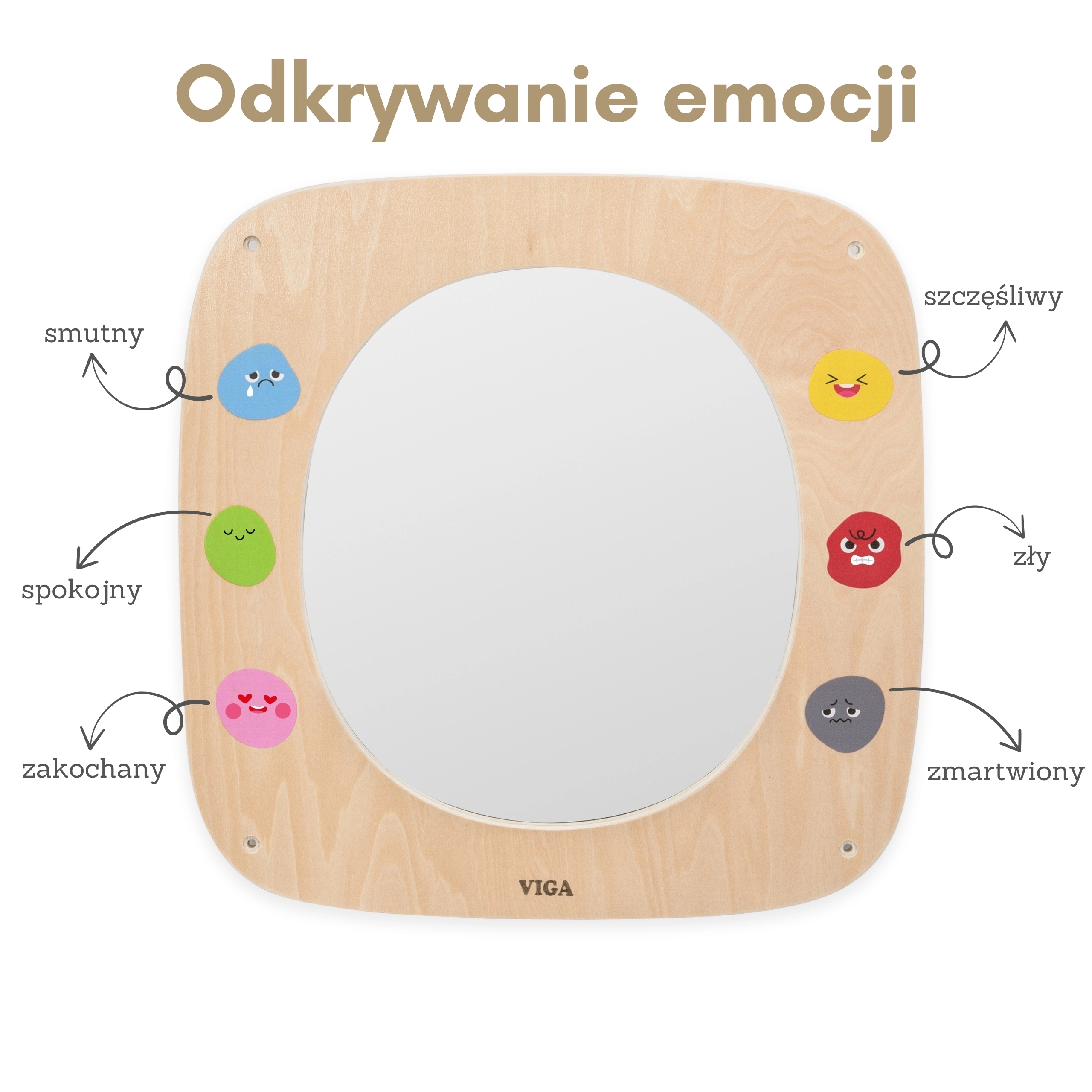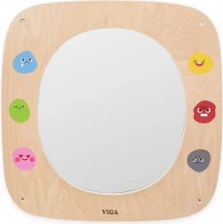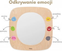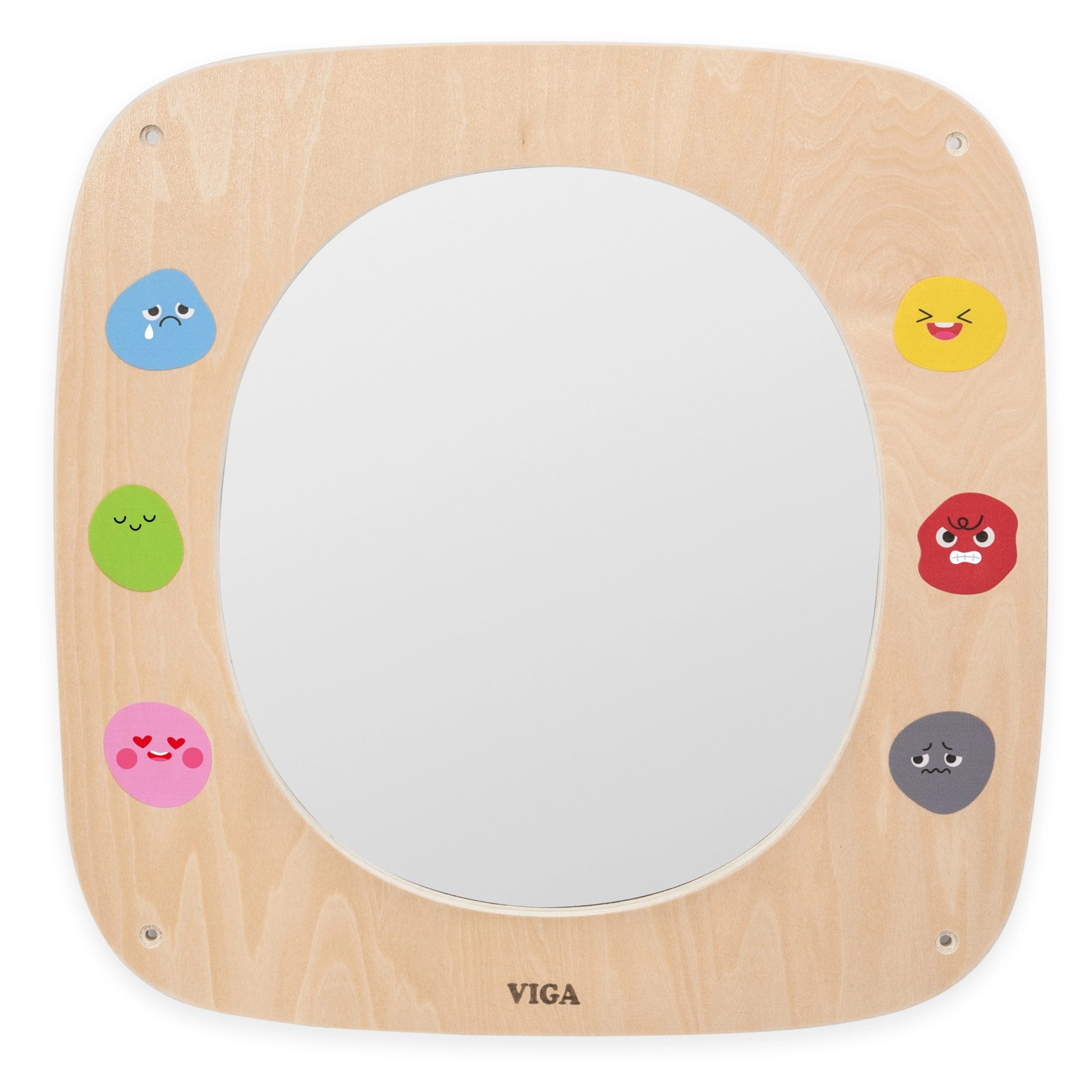 A VIGA fa tükrös tábla ideális gyerekszobába, óvodákba és játszósarkokba. A nagy, biztonságos tükör az áttekinthető kerettel segíti a gyerekeket saját arckifejezéseik felfedezésében, a mimika utánzásában és az érzelmek megkülönböztetésének elsajátításában. A keret körüli színes emotikonok beszélgetésre ösztönöznek az érzésekről, és természetes módon fejlesztik az érzelmi intelligenciát.