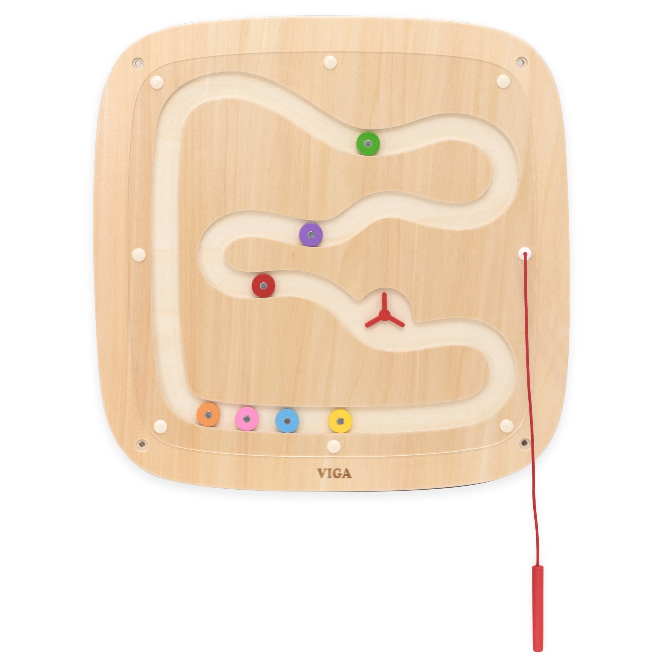 Fedezd fel a gravitáció varázsát ezzel az interaktív VIGA fa táblával! A rögzített mágneses tollal a gyerekek színes korongokat vezetnek két különböző pályán, és figyelik, hogyan változik a sebesség és az irány. A tábla tartós, biztonságos és falra szerelhető, így helytakarékos, miközben fejleszti a finommotorikát, a kéz–szem koordinációt és a logikus gondolkodást.