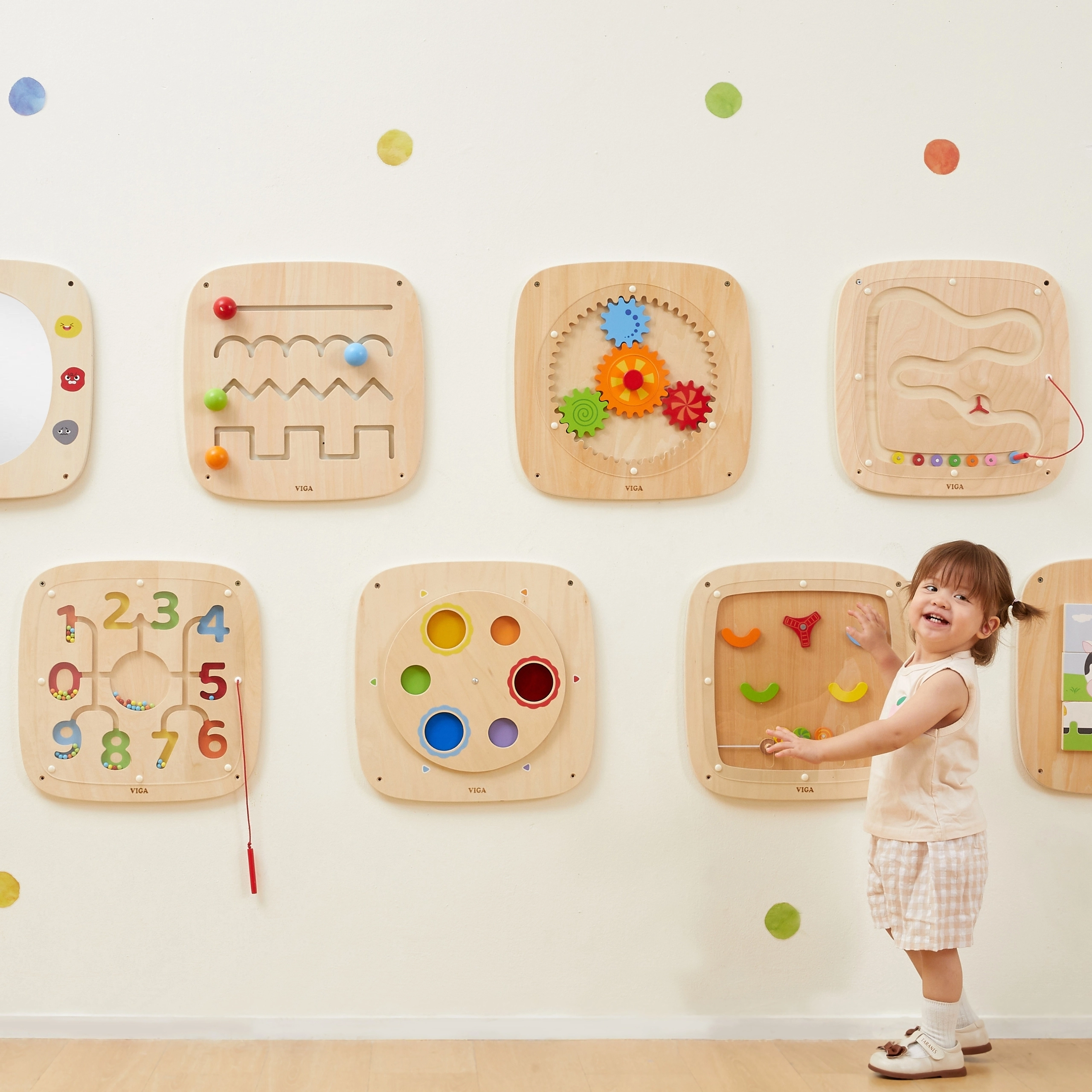 Fedezd fel a számok és színek játékos világát a VIGA falra szerelhető fa táblájával. A mágneses stylus segítségével a gyerekek a mágneses labirintusban mozgatják a golyókat, miközben számolást, szám- és színfelismerést, valamint a finommotorikát gyakorolják. A falra rögzíthető kialakítás helytakarékos, és biztonságos, tartós megoldást kínál a mindennapi játékhoz.