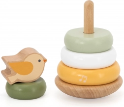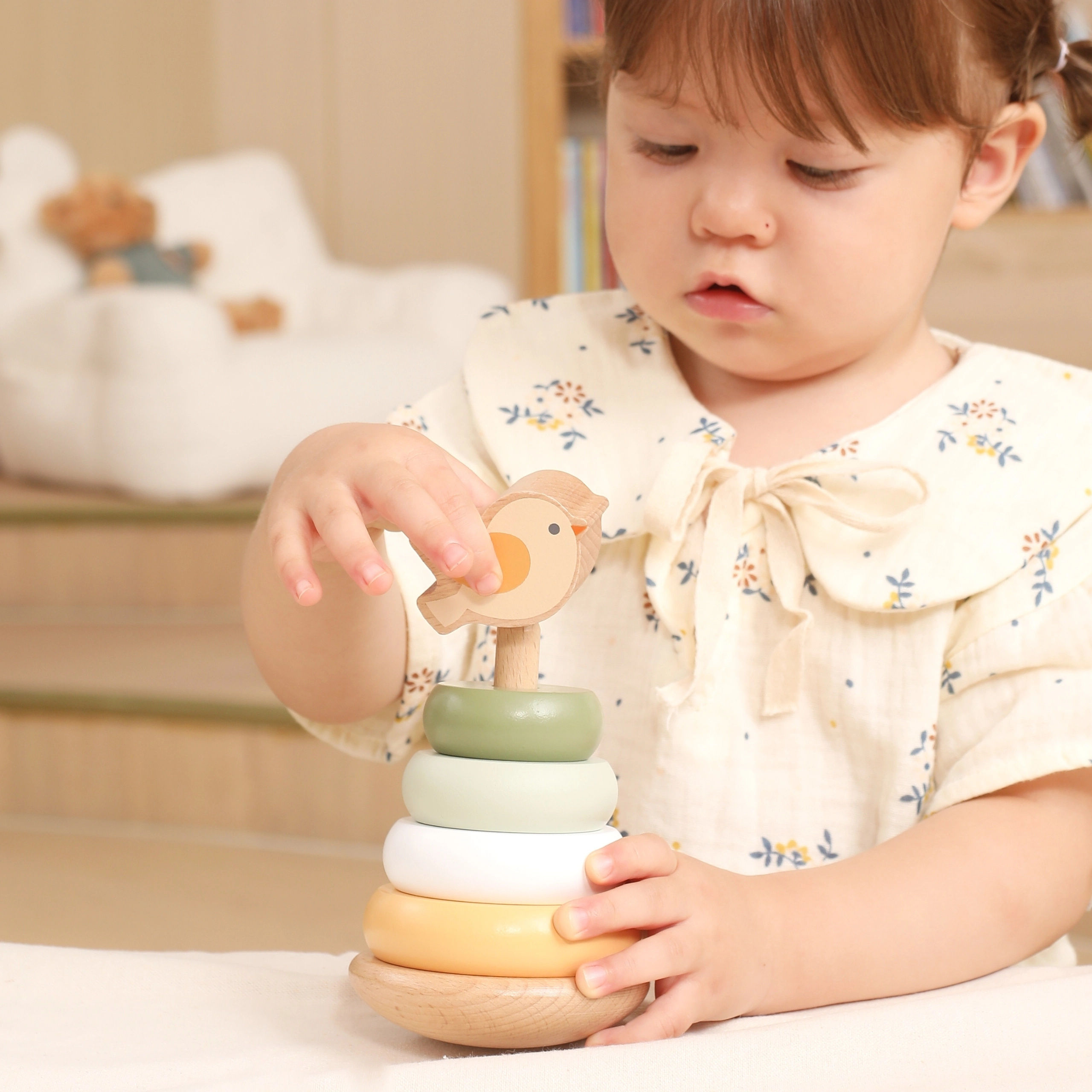 A fa rakosgató torony a tetején lévő aranyos madárkával minden kisgyermeket elbűvöl. A sima élű, színes karikák könnyen megfoghatók és különböző sorrendben rakhatók egymásra, ami támogatja a színek és méretek megkülönböztetését, valamint a problémamegoldást. A stabil alap és a kellemesen lekerekített formák biztonságos kezelést nyújtanak a kis kezeknek.