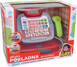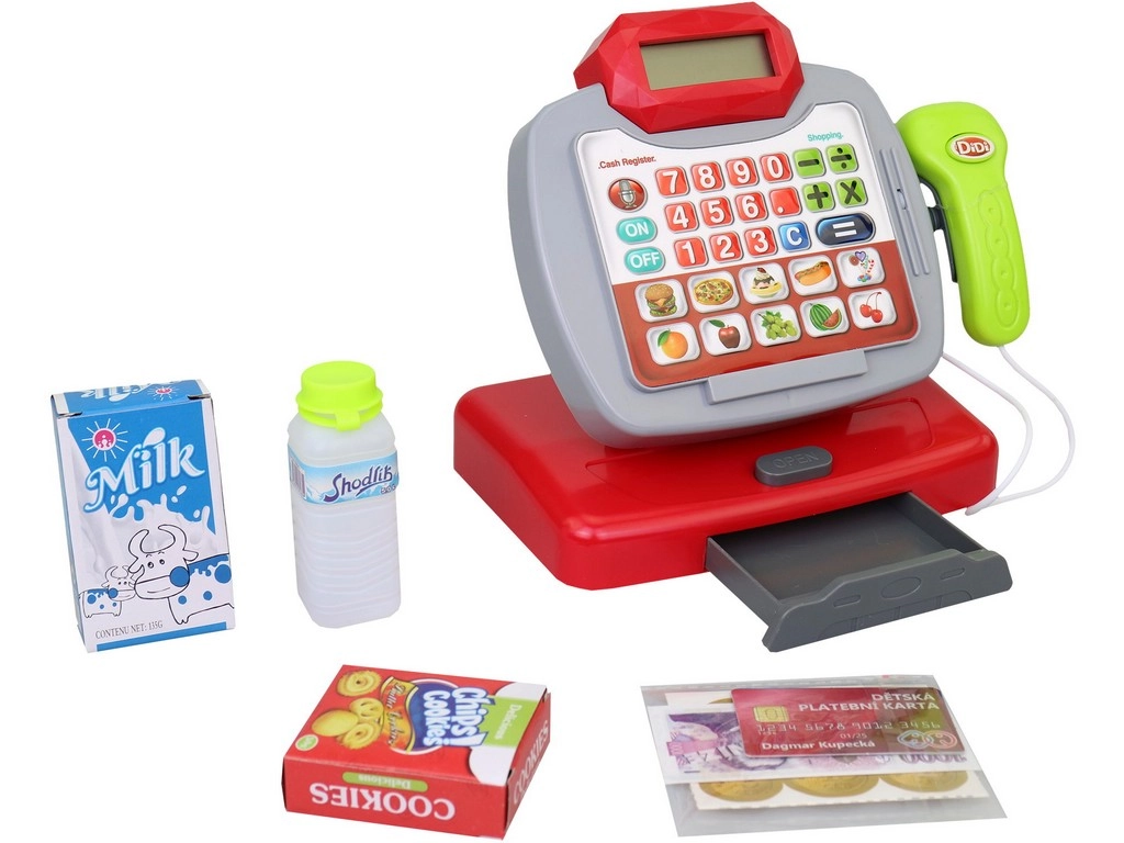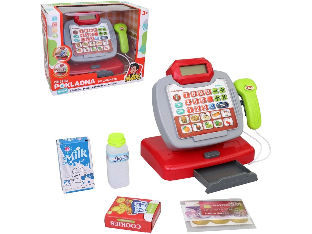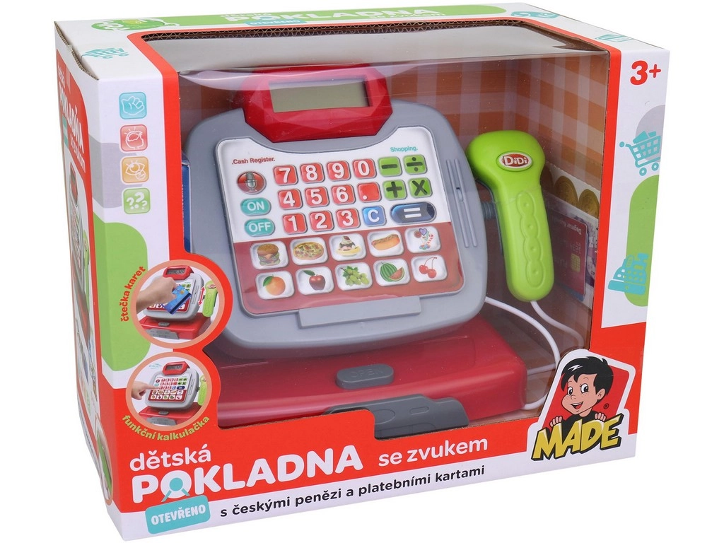 A cseh dizájnú gyerek pénztárgép minden kis árust megörvendeztet. Fény- és hangeffekteket, működő scannert az árak beolvasásához, digitális számológépet és gazdag tartozékkészletet kínál, beleértve a cseh papírpénzeket, bankkártyákat és műanyag érméket. Tápellátását 2× AA elem biztosítja (tartozék). 3 éves kortól ajánlott.