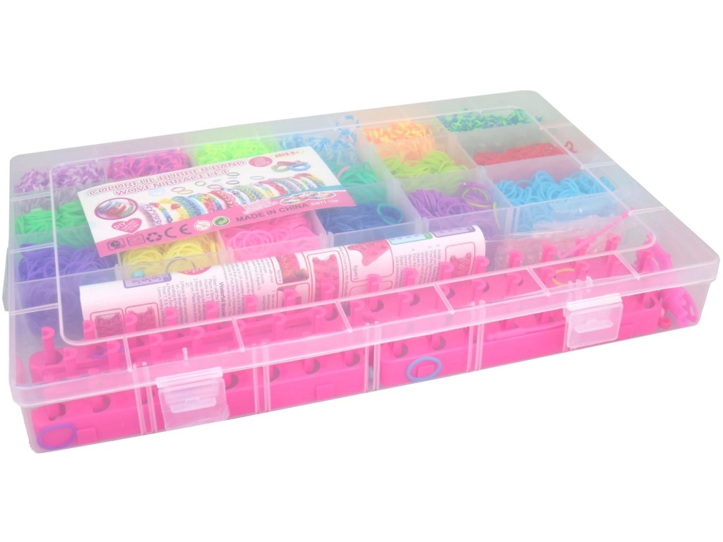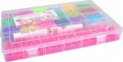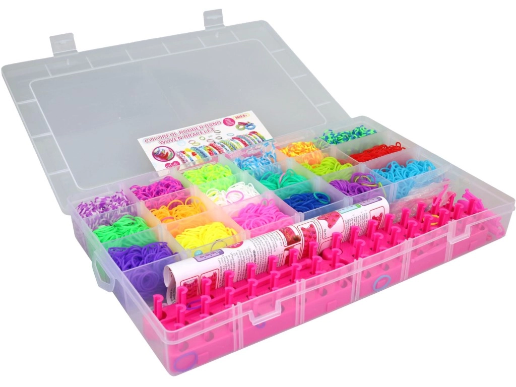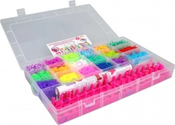 Ezzel a gumigyűrű-készlettel a gyerekek és a kezdő alkotók is órákon át szórakozhatnak. Az áttekinthető, 18 rekeszes doboznak köszönhetően az egyes színek mindig kéznél vannak, rendetlenség és keveredés nélkül. Az átlátszó fedél gyors tájékozódást és könnyű szállítást tesz lehetővé.