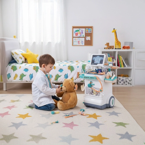 A guruló gyerek orvosi állomás élethű orvosos játékot hoz az otthonba. A két szintes, kerekes kocsi EKG/Röntgen kijelzővel és gazdag felszereléssel lehetővé teszi, hogy a gyerekek a páciensekről – plüssökről és családtagokról – gondoskodjanak. A fény- és hangeffektek (szívverés, EKG jel) felkeltik a kíváncsiságot és közelebb hozzák a rendelő működését.