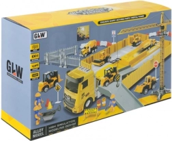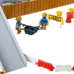 - A készlet tartalma: TIR kihajtható platformmal, toronydaru, betonkeverő, úthenger, targonca, lánctalpas kotró, rakodó, billenőplatós, 2 figura, bóják, korlátok, táblák, hordók, szalagok, talicska és lapát.