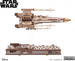 A modell működő elemei örömet okoznak: nyitható pilótafülke, levehető futómű, törzsfedél R2‑D2 stílusú gombbal, valamint S‑foil szárnyak támadó pozícióba kapcsolással. A talapzat tápellátása 3× AA elemmel vagy USB‑C kábellel történik (nem tartozék). Az összeszerelés ragasztó és szerszám nélkül zajlik.