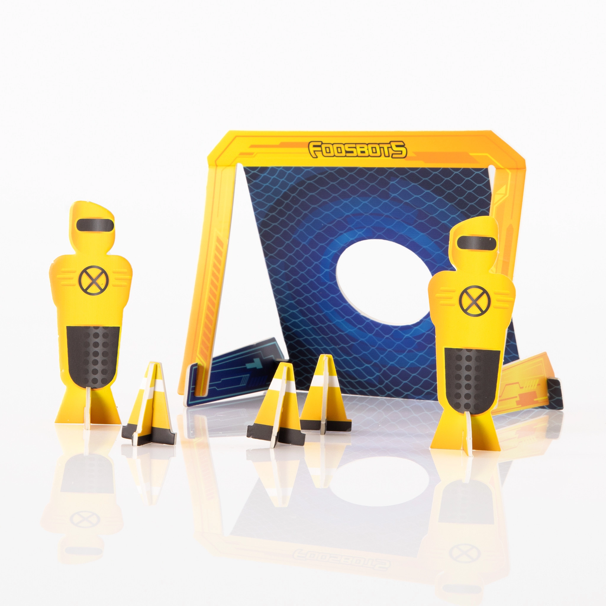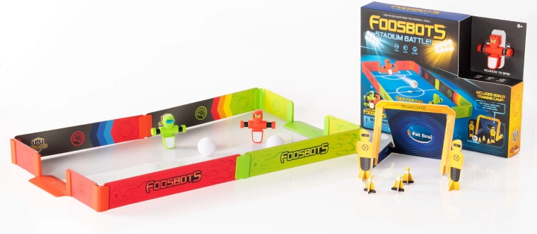A Foosbots stadion csata a nappaliba hozza az asztali foci pörgős akcióját zsebméretben. A színes palánkoknak, a beépített kapuknak és a két ujj-robotnak köszönhetően könnyen indul az egy az egy elleni derbi. Irányítsd a „botokat” ügyes ujjakkal, lődd el a fehér labdát, és védd a kapud villámgyors tempóban.