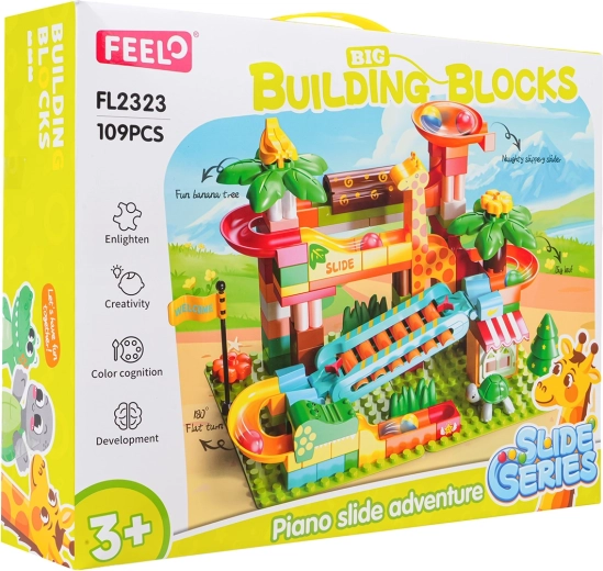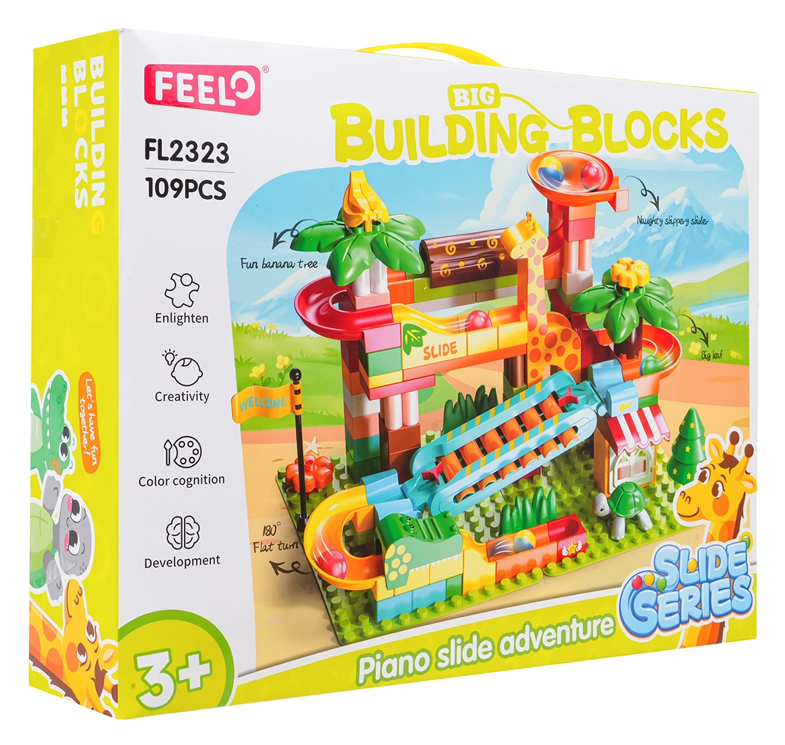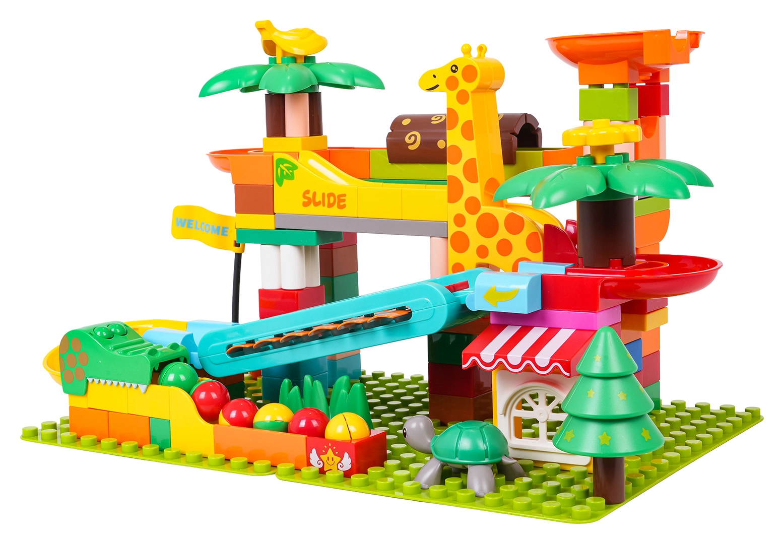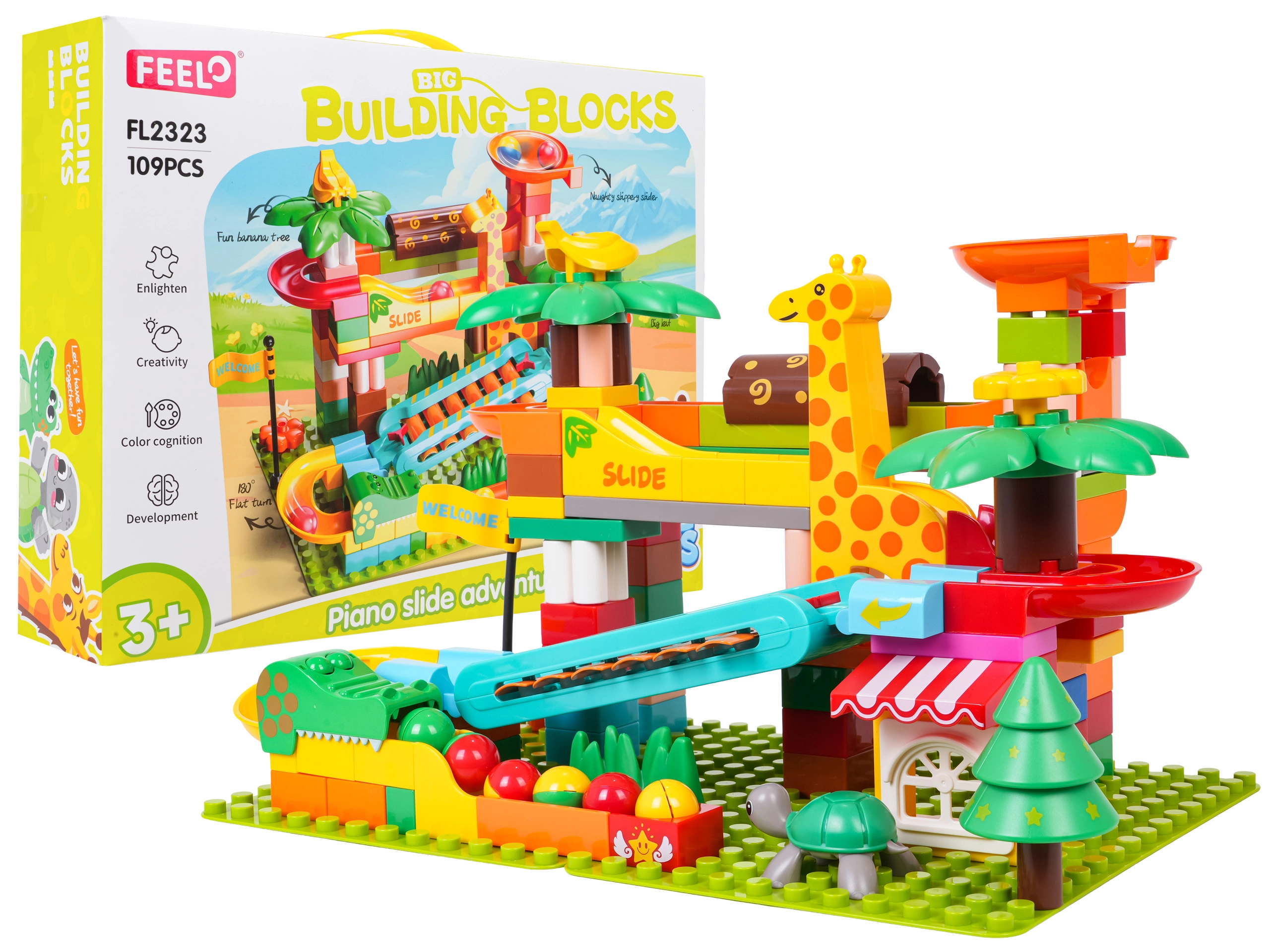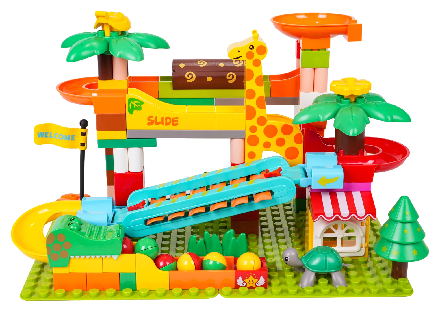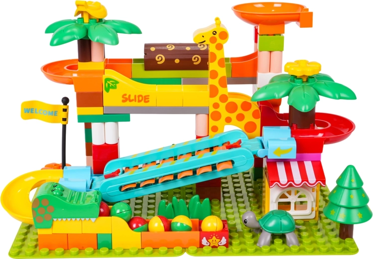 Ez a kreatív építőkészlet safari hangulatot varázsol a gyerekszobába: pálmafák, állatkák és házikó egészítik ki az átgondolt golyópályát csúszdákkal, tölcsérekkel és zongora elemmel – amikor a golyók átgurulnak a cintányéreken, vidám dallamok születnek. A stabil alap és a könnyű bepattintás gondtalan építést és játékot garantál.