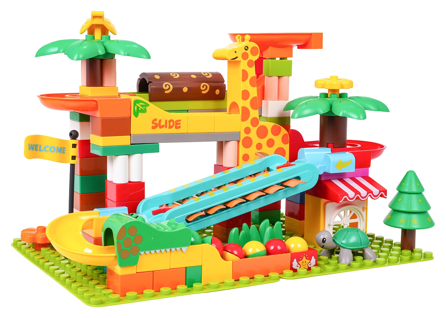 Színes rámpák, tölcsérek és csúszdák pálma díszítéssel és állatfigurákkal, amelyek újabb és újabb pályák építésére csábítanak.
