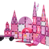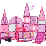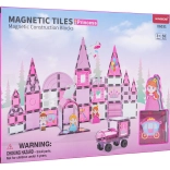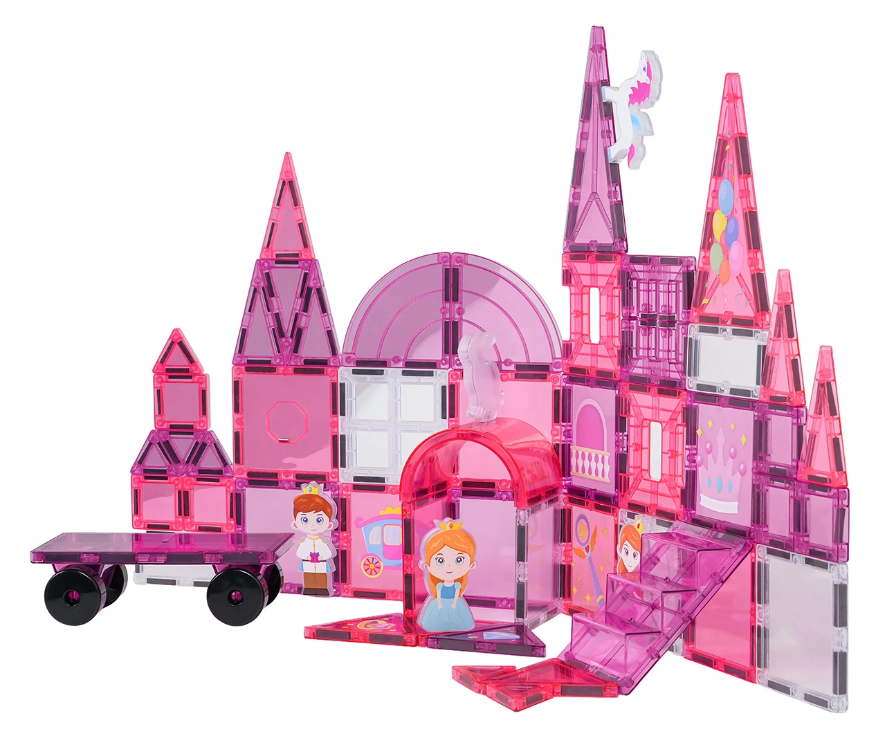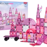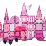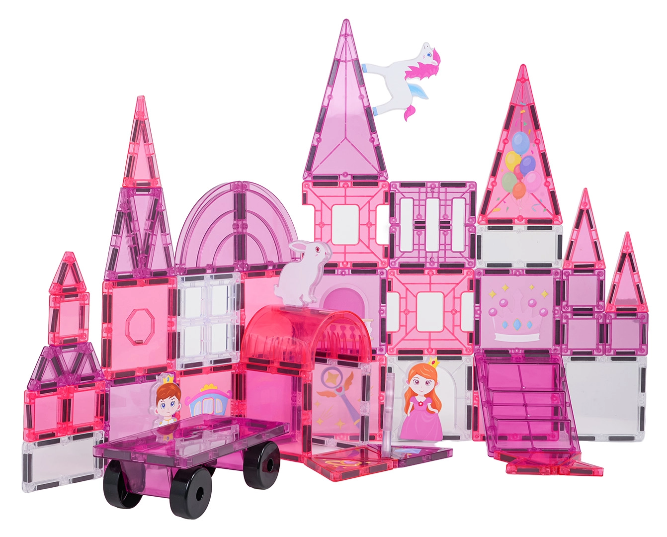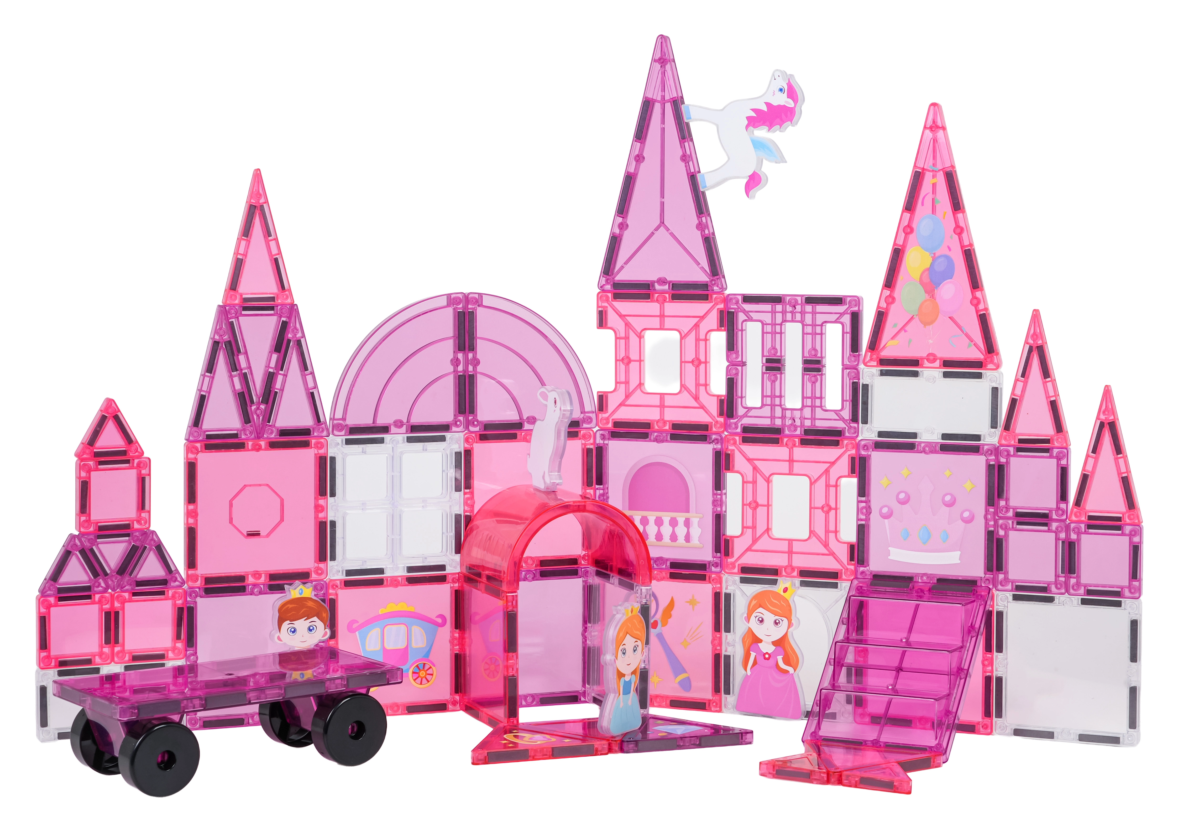 A Mágneses építőkészlet Rózsaszín hercegnő fantáziadús alkotásra hívja a gyerekeket. A különböző alakú, áttetsző színes elemek intuitívan kapcsolódnak, így tornyok, kapuk, ablakok, lépcsők és teljes mesekastélyok építhetők. A kerekes alváznak köszönhetően hintók és kocsik is létrehozhatók, a mellékelt figurákat pedig könnyű bevonni a játékba.