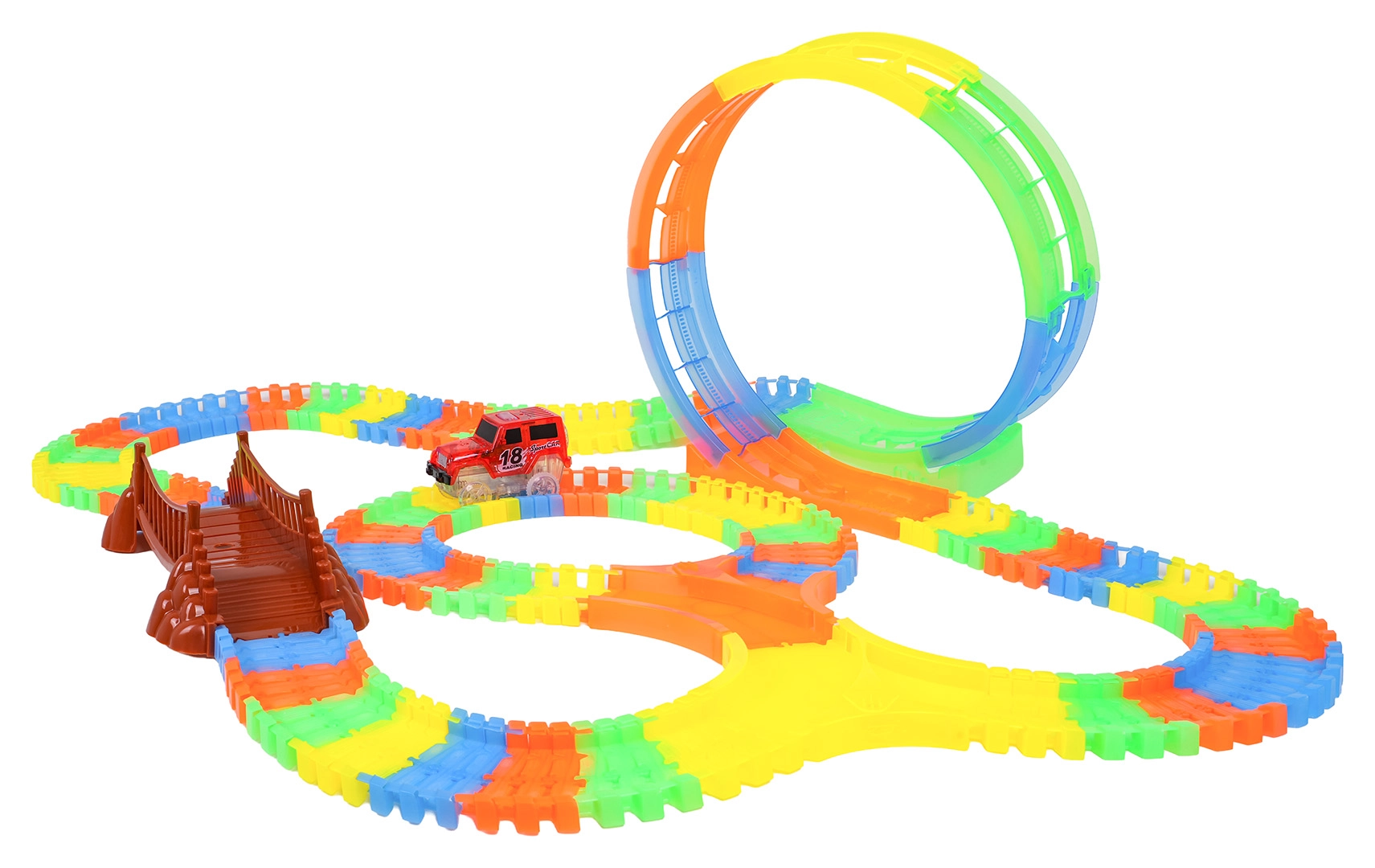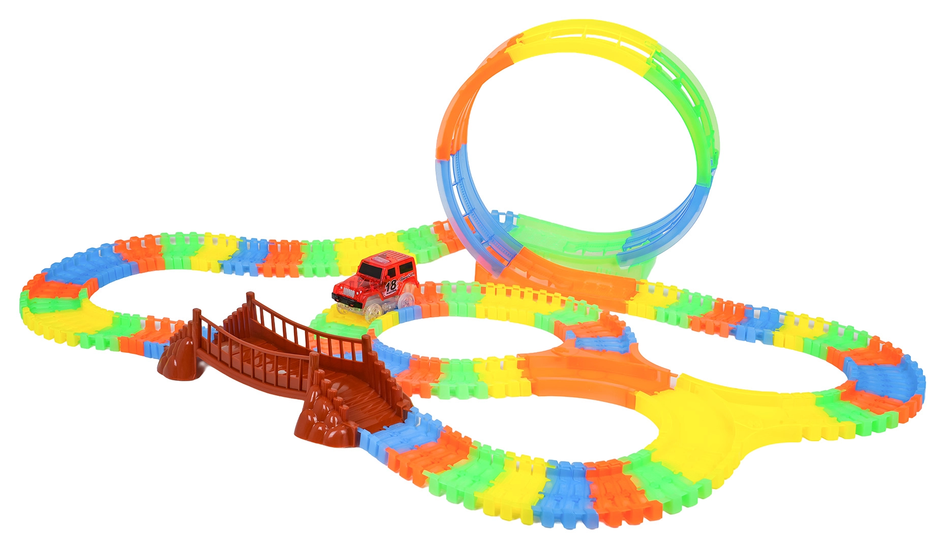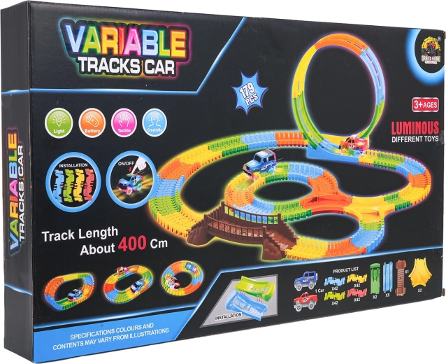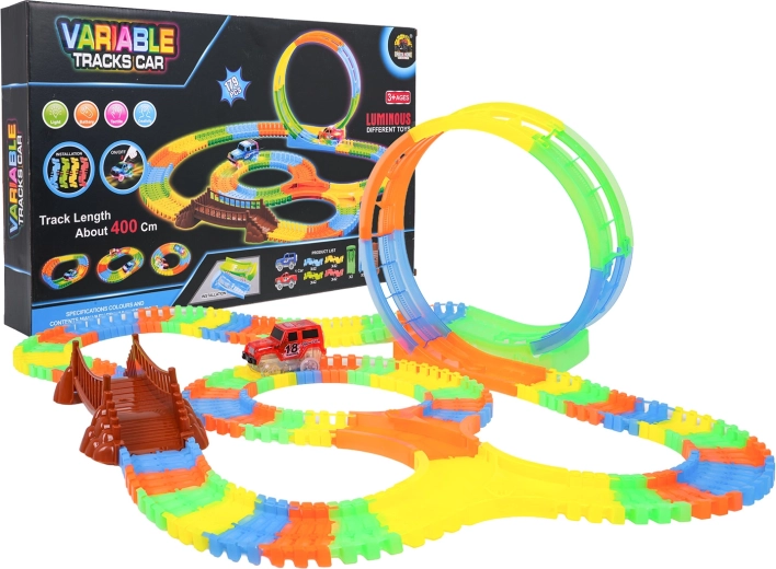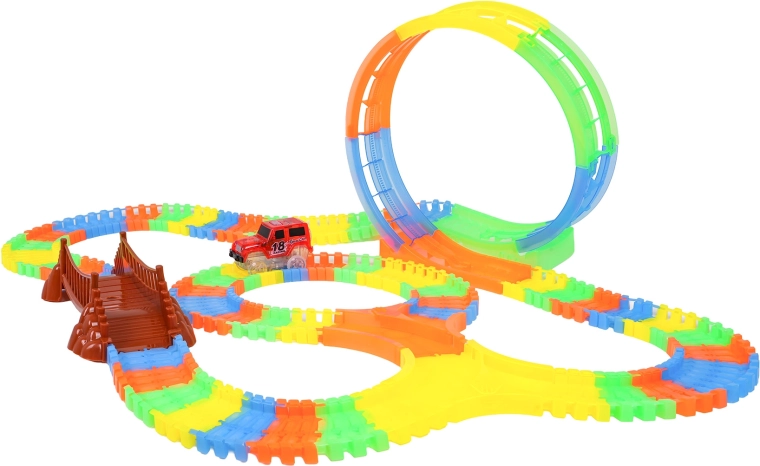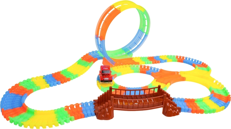 Ez a színes versenypálya már 3 éves kortól örömet szerez a gyerekeknek. A rugalmas szegmenseknek köszönhetően pillanatok alatt építhet egyeneseket, kanyarokat, hidat és nagy, függőleges hurkot. A fluoreszkáló kivitel sötétben világító hatást biztosít, miközben a LED-es kisautó végighalad a pályán és fénycsíkot hagy maga után.