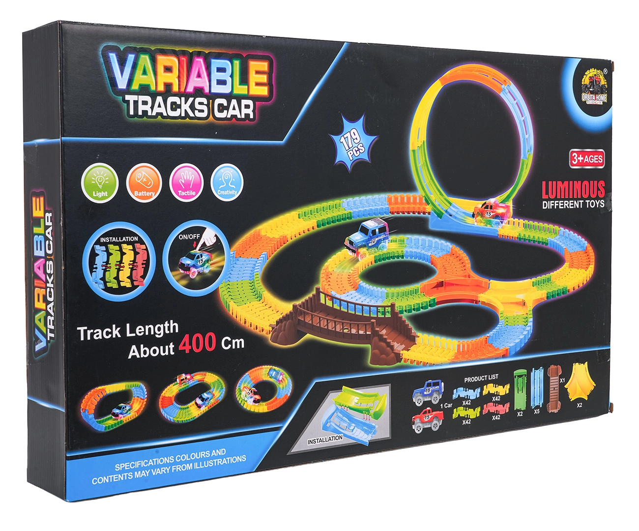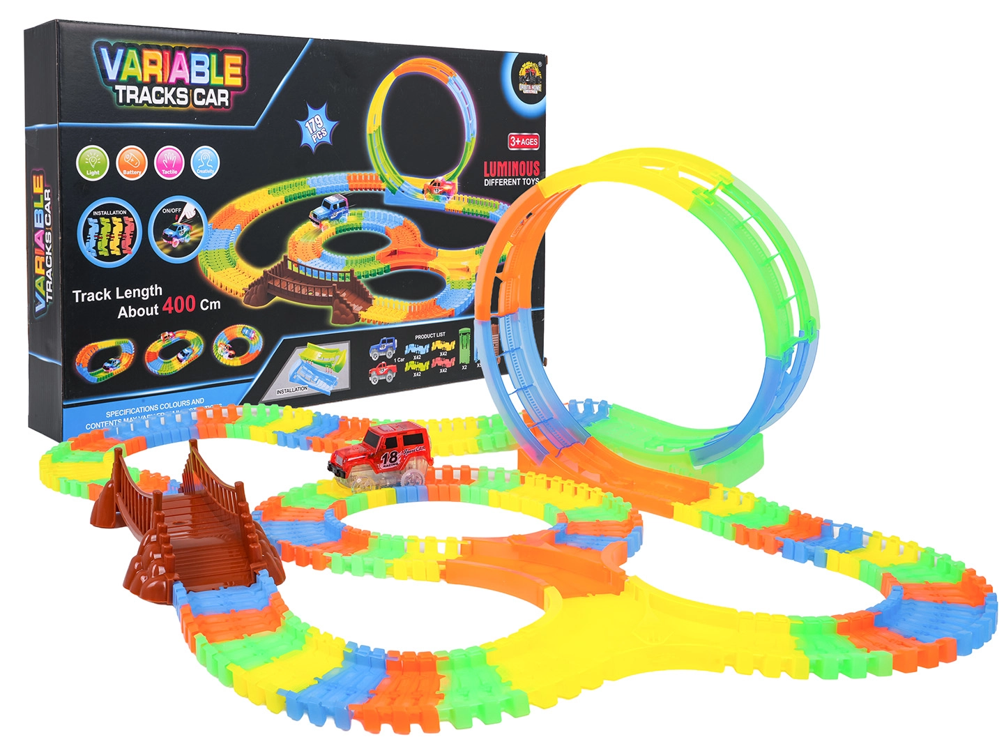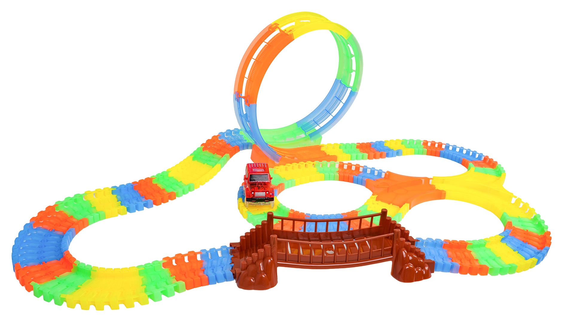 Ez a színes versenypálya már 3 éves kortól örömet szerez a gyerekeknek. A rugalmas szegmenseknek köszönhetően pillanatok alatt építhet egyeneseket, kanyarokat, hidat és nagy, függőleges hurkot. A fluoreszkáló kivitel sötétben világító hatást biztosít, miközben a LED-es kisautó végighalad a pályán és fénycsíkot hagy maga után.