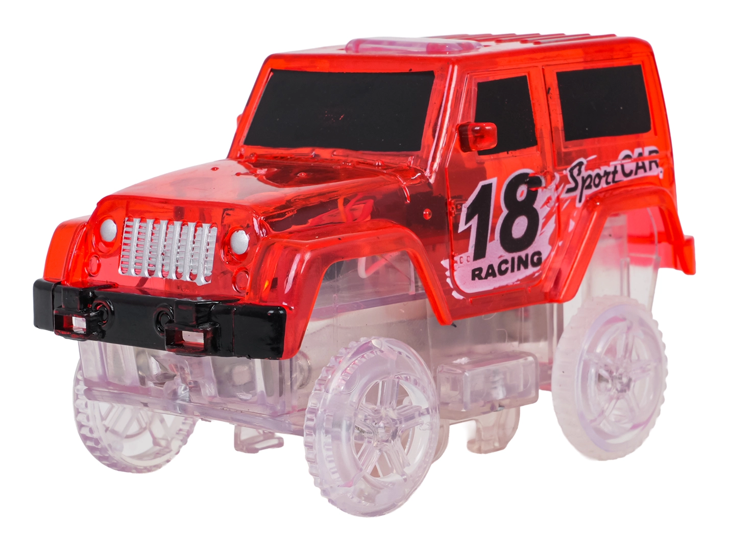 Az átlátszó karosszéria és a fényhatások a sötétben is látványossá teszik a vezetést. Csak nyomja meg a tetőn lévő gombot, és indulhat a menet.