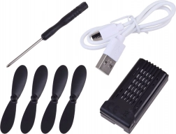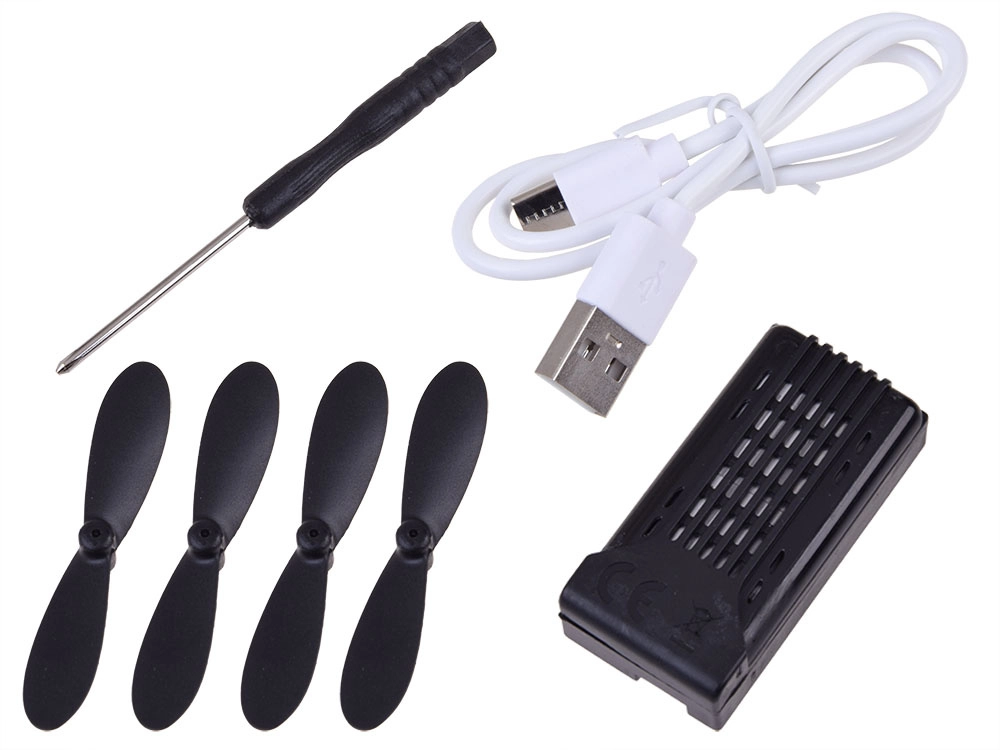 - Drón, 2,4 GHz-es távirányító, USB töltőkábel, 3,7 V-os akkumulátor, 4× pótpropeller, csavarhúzó