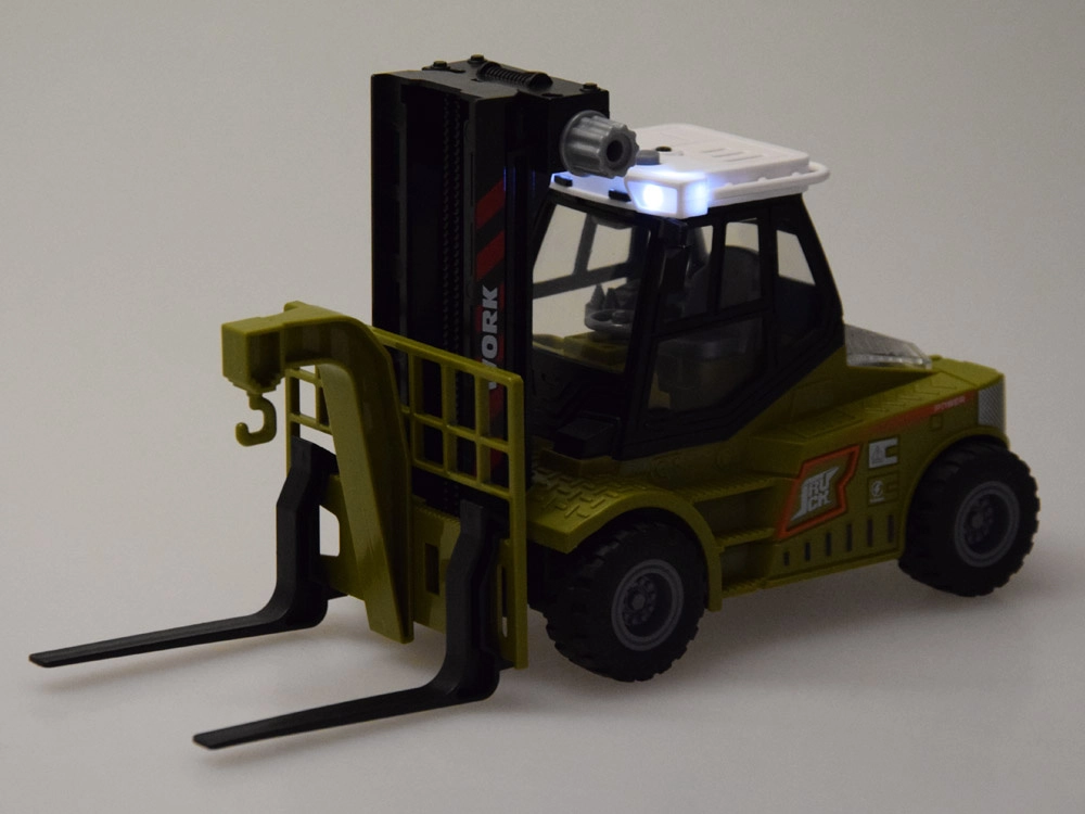Két gomb 4 különböző hangot irányít (indítás, tolatás, emelés, duda), villogó fehér fénnyel kiegészítve a maximális játékélményért.