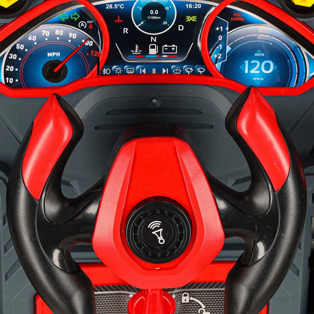 - Valósághű elemek: nyitható motorháztető, fények, motor- és dudahangok, indítógomb, vészfény, váltókar.