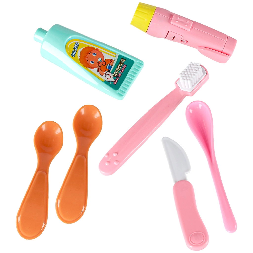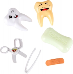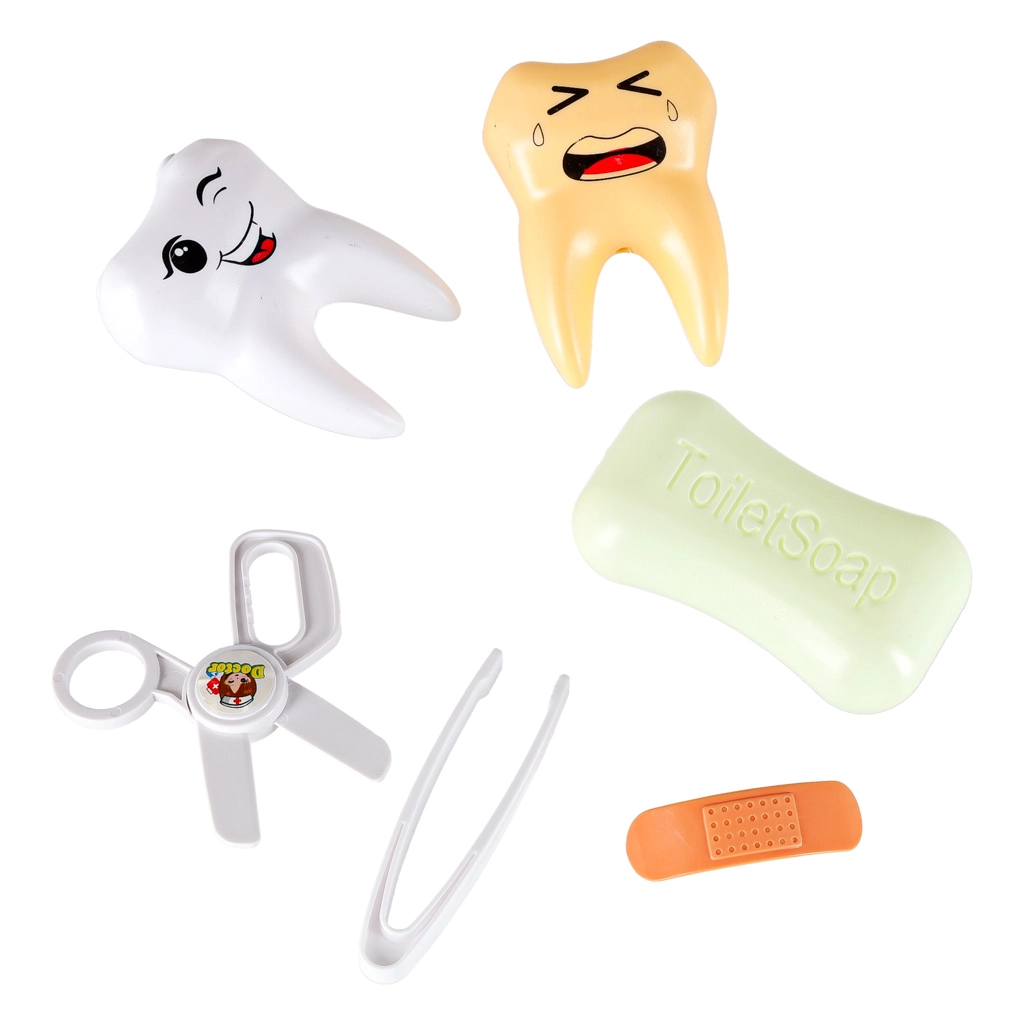 - orvosi köpeny és sapka, zárható füllel ellátott táska, összecsukható infúziós állvány, összecsukható vérnyomásmérő pumpával, névkitűző, írótábla csipesszel és ceruzával, összecsukható sztetoszkóp, otoszkóp, zseblámpa, hőmérő, pulzoximéter, fogászati tükör, „fúró”, „fecskendő”, sárga „szuvas” fog, fehér fog töméssel, fogkrém és fogkefe, reflexkalapács, szappan és tégely, szike (játékszer), csipesz, olló, 2× gyógyszertartó doboz, 2× kapszula alakú dobozka, kanalak, ragtapasz, szemüveg, használati útmutató
