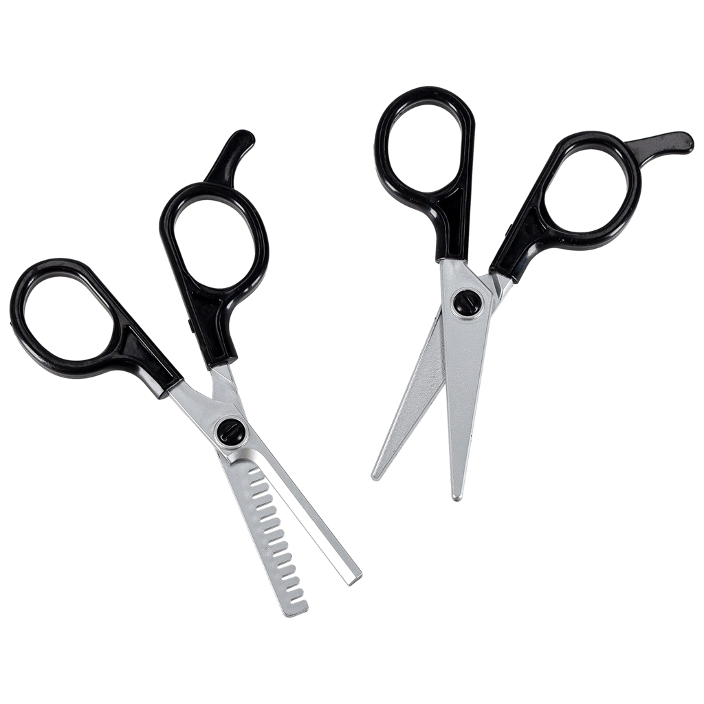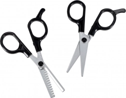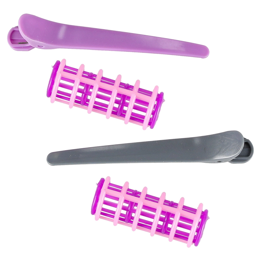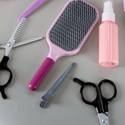 Kefe, fésű, él nélküli olló, ritkító olló, hajcsavarók, csipeszek és üres flakon – teljes felszerelés a mindennapi fodrásztörténetekhez.