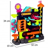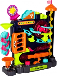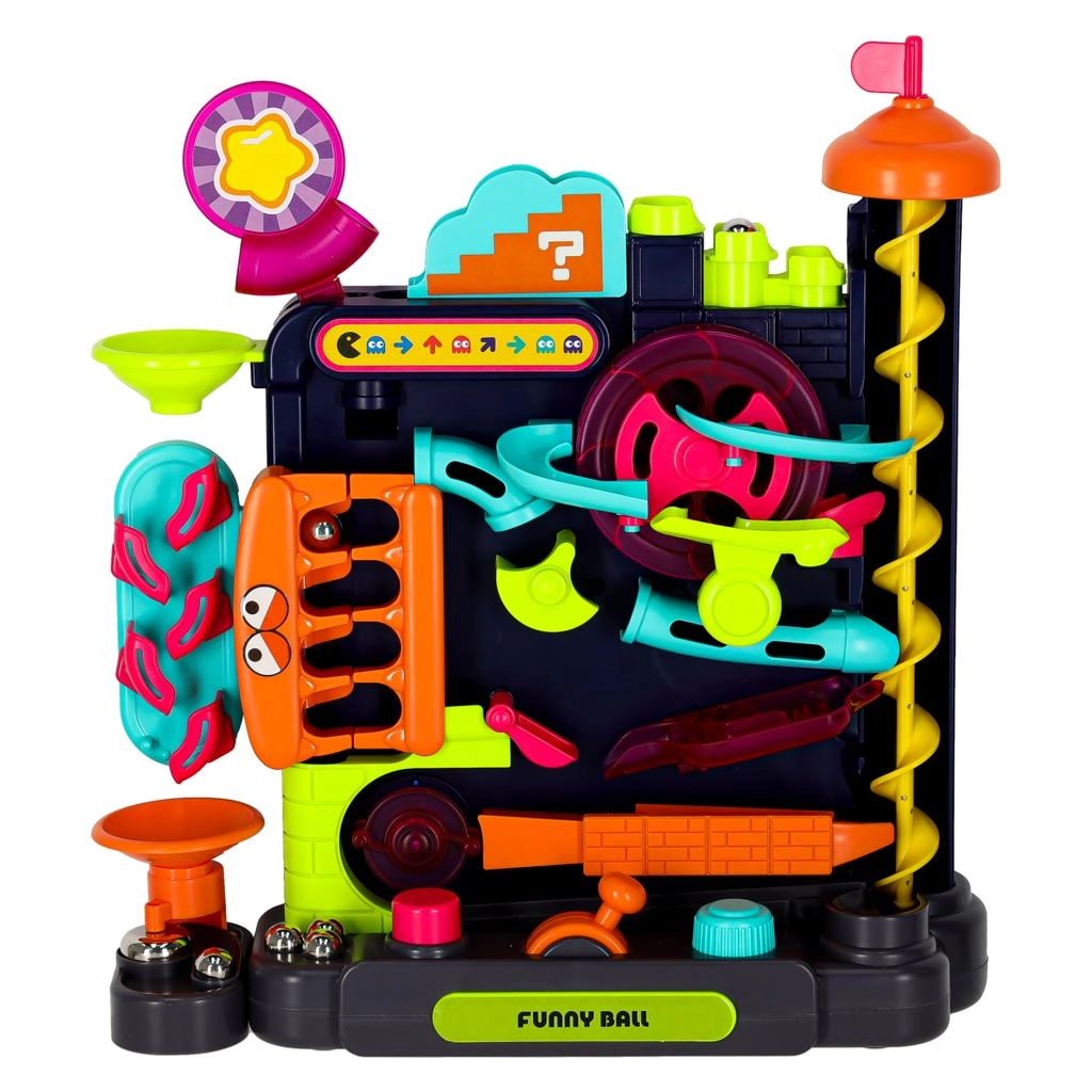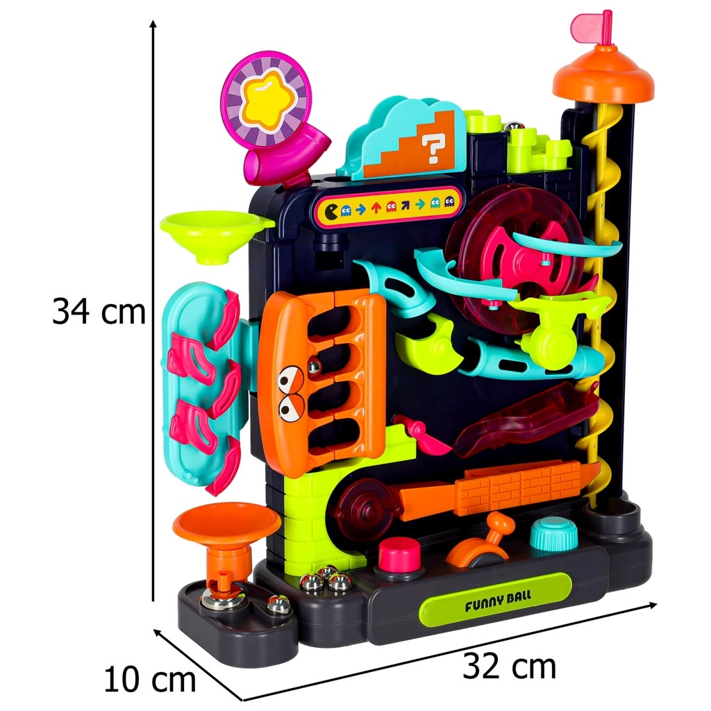 A karok, gombok és forgó mechanizmusok lehetővé teszik, hogy a gyerekek aktívan irányítsák a golyók útját, fejlesszék a finommotorikát és a mozdulatok pontosságát.