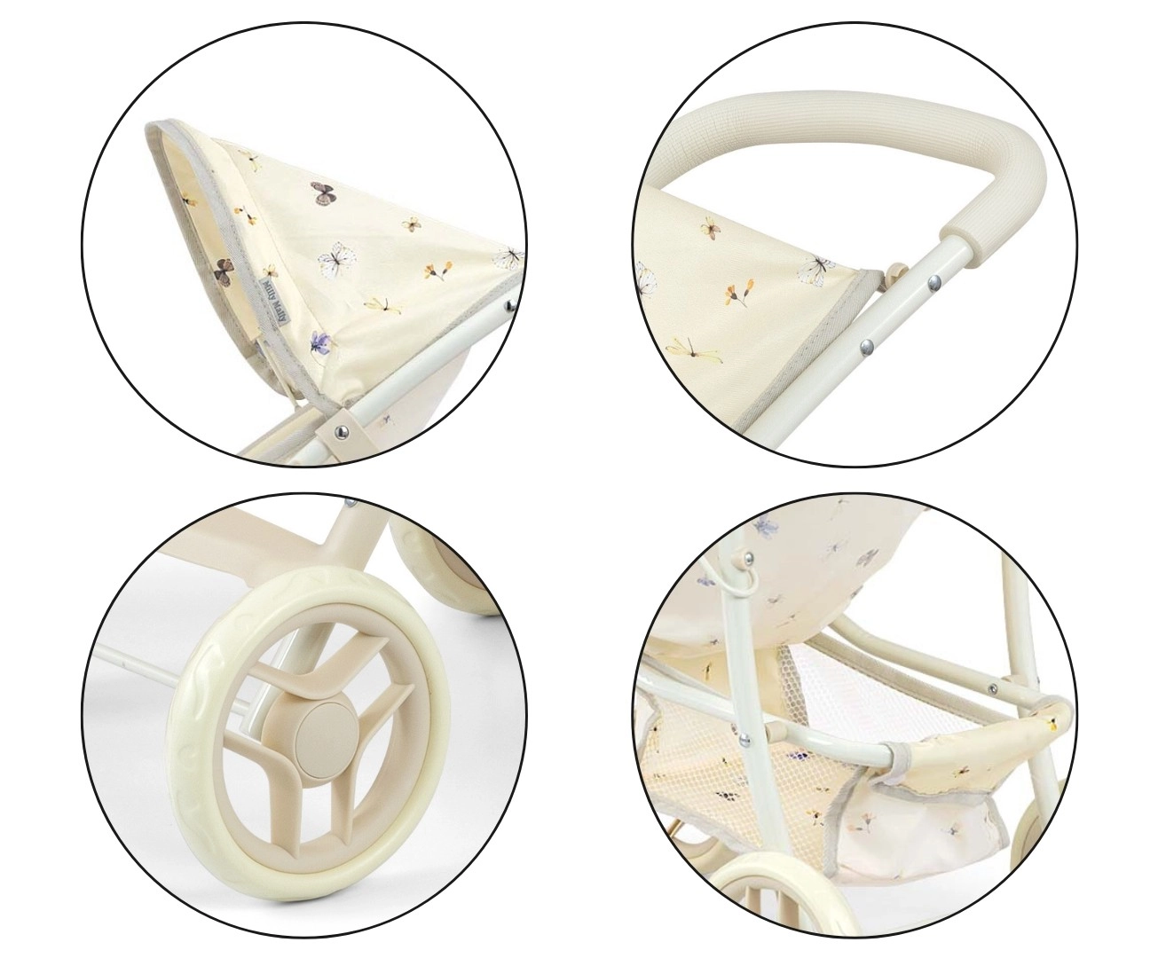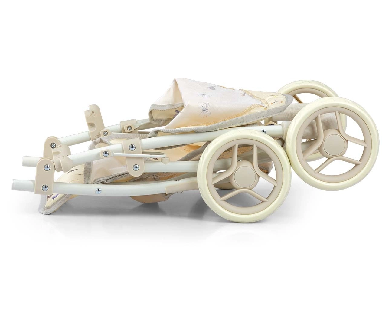 A fém váznak és a lapra csukható kialakításnak köszönhetően a babakocsi könnyen hordozható és tárolható. A poliészter textil huzat levehető és mosható, így a babakocsi a mindennapos használat mellett is tiszta marad. A véletlenszerű összecsukódás elleni védelem nyugodt és biztonságos játékot biztosít.