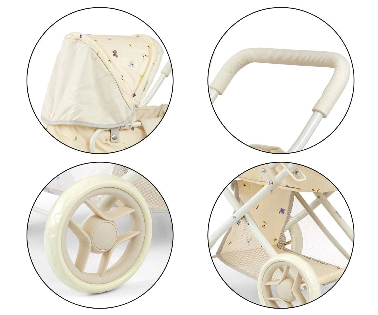 A masszív fém szerkezet stabilitást ad, míg a habgumi kerekek simán és halkan gördülnek. A strapabíró poliészter huzat könnyen levehető és mosható. Az alsó hálós kosár elfér benne egy palack, ruhácskák és kiegészítők, a habos markolat kellemes fogású.