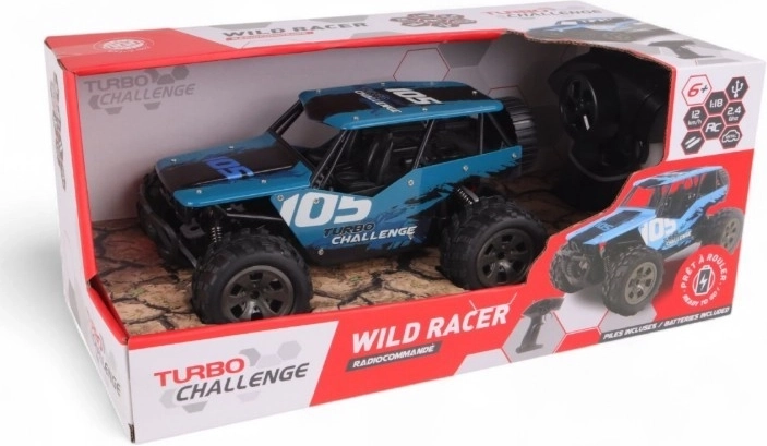 A TURBO CHALLENGE Wild Racer RC autó ideális választás kezdőknek és fiatal versenyzőknek egyaránt. A masszív fém szerkezetnek és a gumibroncsoknak köszönhetően különféle felületekkel birkózik meg, miközben kiváló stabilitást tart fenn. A rugós lengéscsillapítók minden keréken hatékonyan nyelik el az egyenetlenségeket, így biztosítva a sima haladást.