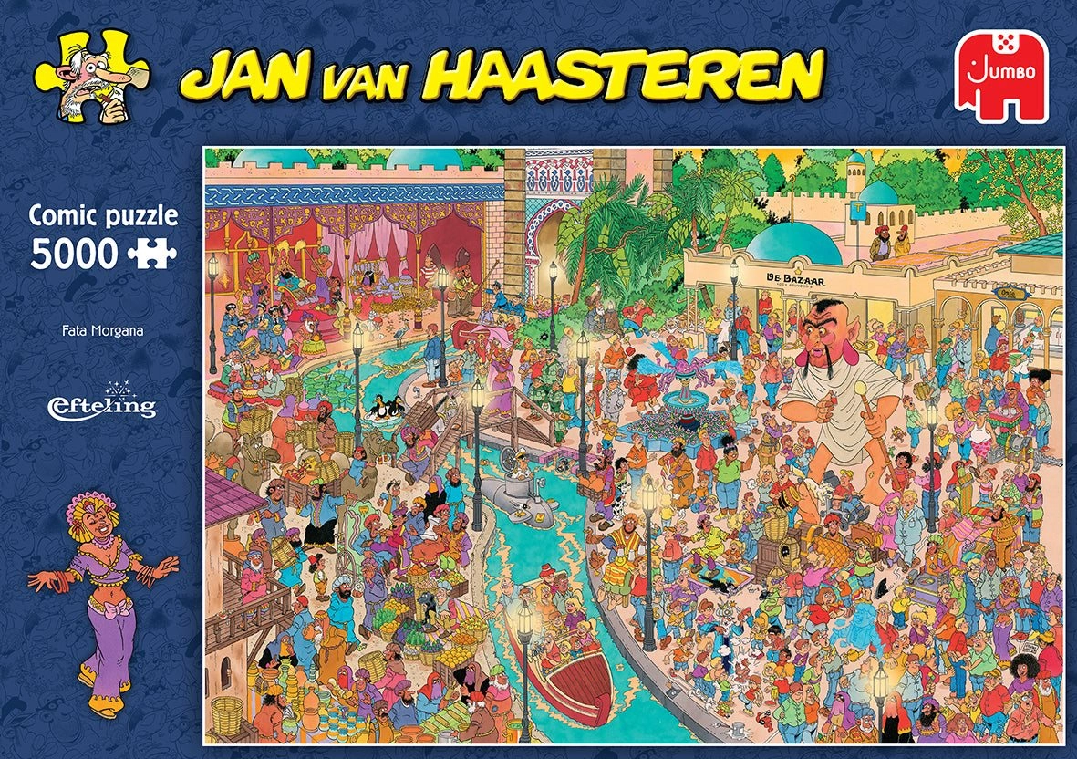 Merüljön el Jan van Haasteren illusztrátor színes káoszában és játékos világában. Ez a nagy méretű puzzle az Efteling vidámpark Fata Morgana témájával tökéletes választás a kihívásokat kedvelőknek és a gyűjtőknek. Az illusztráció minden centimétere rengeteg gegget és a szerző ismert „aláírásait” rejti – a cápauszonytól a Mikuláson át egészen a művész önarcképéig.