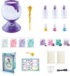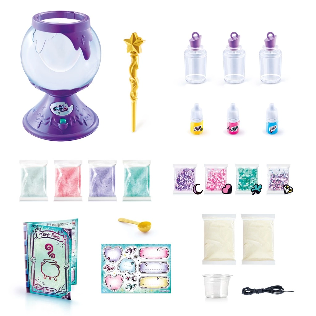 Készíts akár 10 bűvös nyálka-elixírt a varázsüstben fény- és ködeffektekkel. Kövesd a recepteket, és keverj színt váltó, sötétben világító és bugyborékoló elixíreket. Csak szórd bele a port, add hozzá az elixírt és a dekorációkat, keverd meg az arany pálcával, majd a kész nyálkákat tedd a stílusos, nyakban hordható üvegcsékbe.