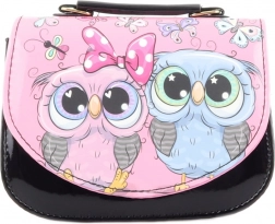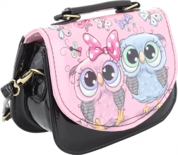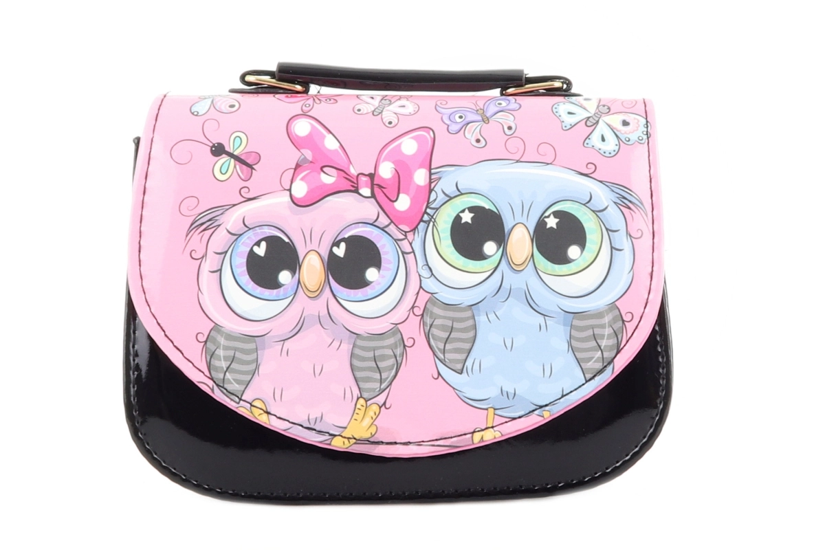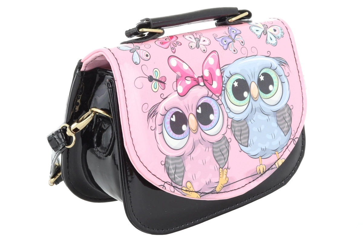 Ez a vidám bagolynyomatos, elegáns fekete gyerek kézitáska remek választás zsebkendők, kis kincsek vagy egy apró pénztárca hordására. A fényes alsó rész és a színes, bájos részletekkel díszített hajtóka felkelti a figyelmet és örömet szerez minden gyermeknek.