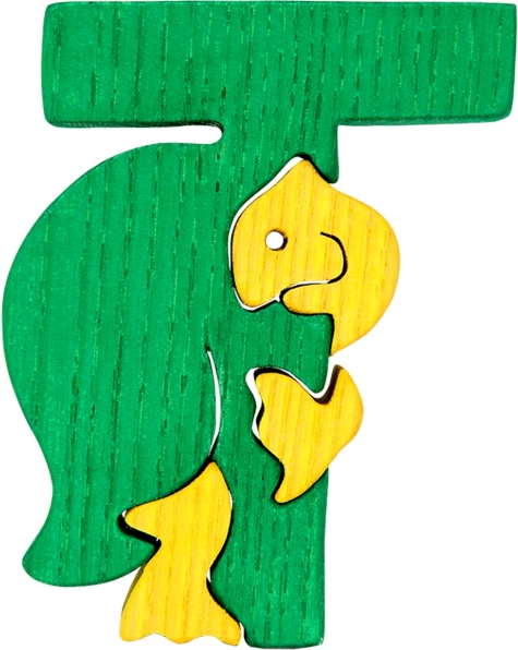 A gyerekeknek szánt, behelyezhető T betű aranyos kis teknőssel ideális eszköz az első ismerkedéshez az ábécével. Az elemek simán illeszkednek egymáshoz, és a tömör fából készült, masszív kivitelnek köszönhetően bírják a mindennapos játékot. A felület gyerekbarát, biztonságos festékekkel van kezelve.